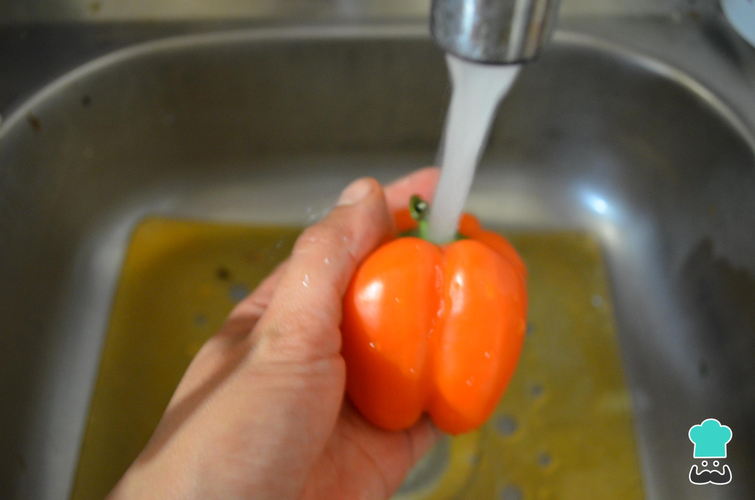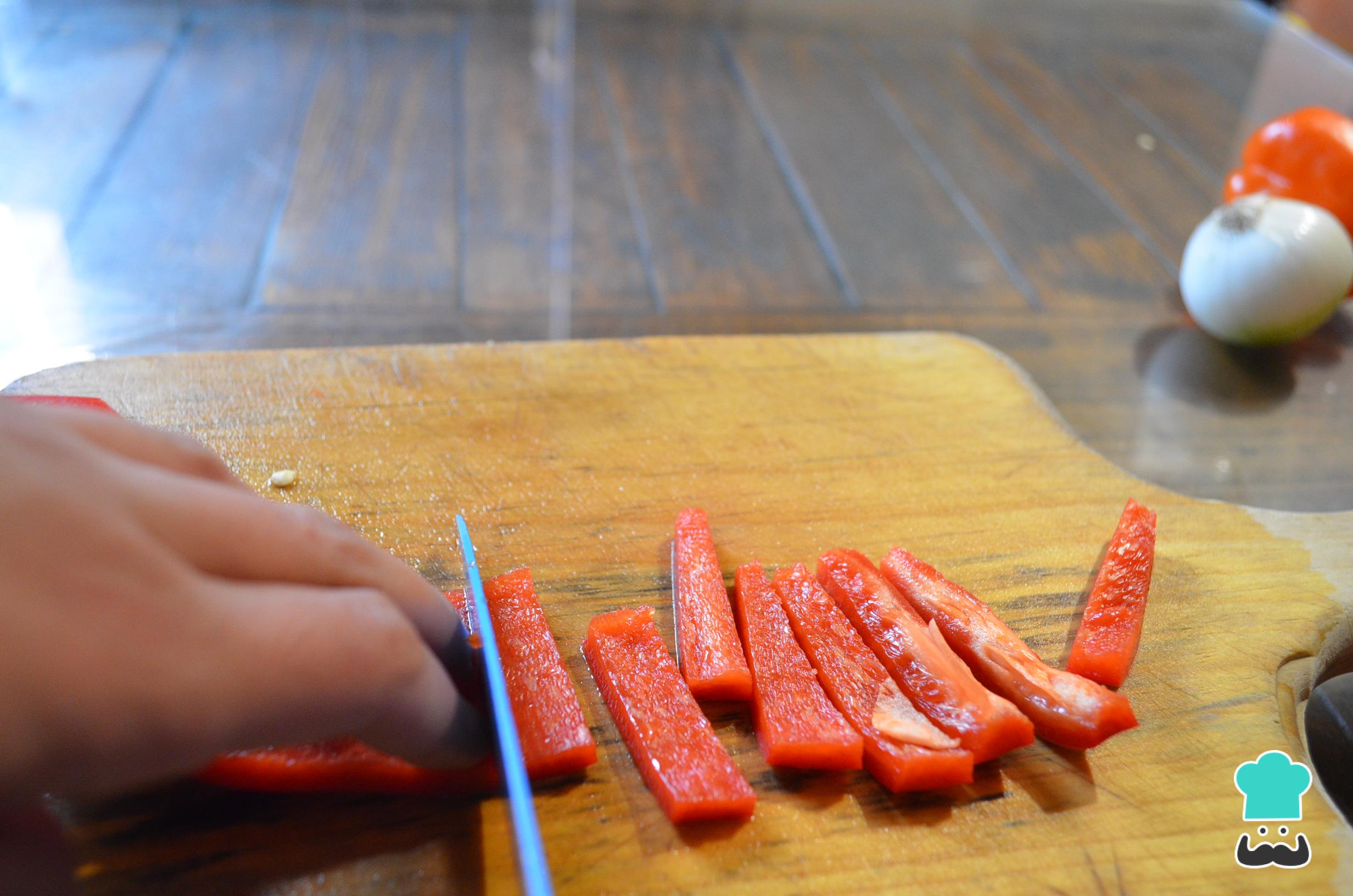 Una vez que las verduras estén limpias, vamos a cortar el pimiento en julianas y a filetear nuestra cebolla.
