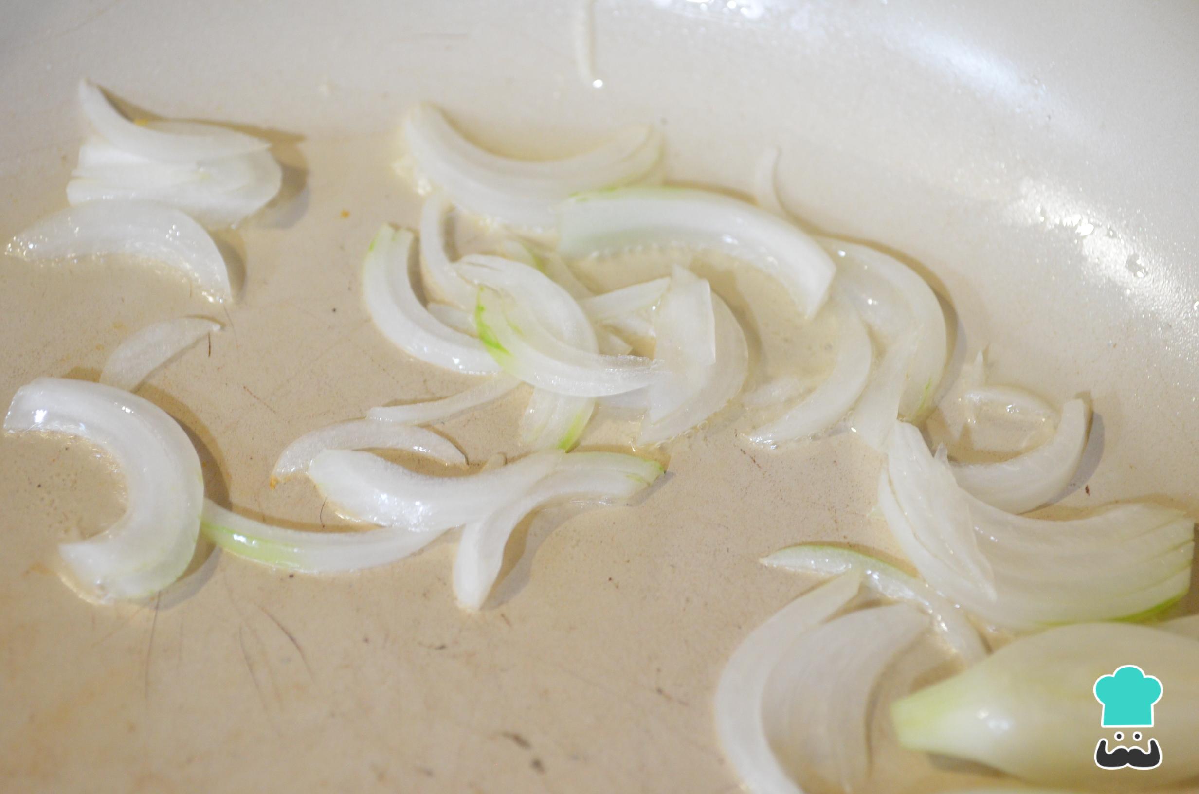 En una sartén caliente rociamos aceite de oliva y ponemos a cocinar la cebolla hasta que esté un poco transparente.