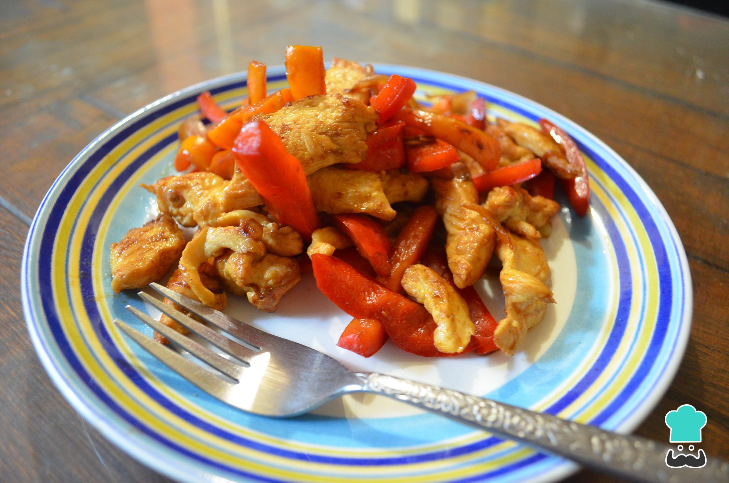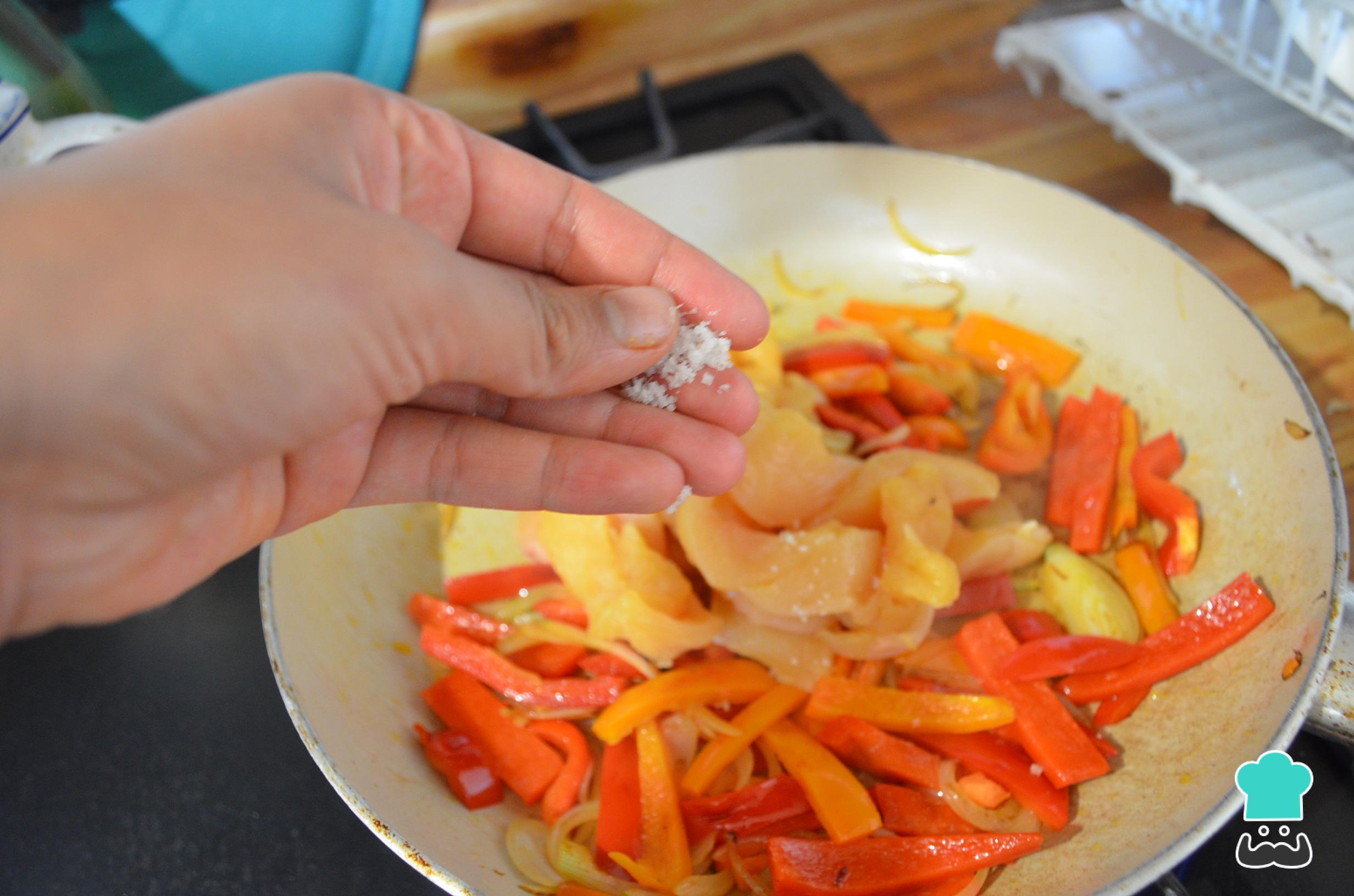 Una vez que haya cambiado de color agregamos los pimientos y el pollo, dejamos la sartén en el fuego sin dejar de mover hasta que esté el pollo bien cocido. Puedes sazonar con sal y pimienta o unas gotitas de salsa de soya.