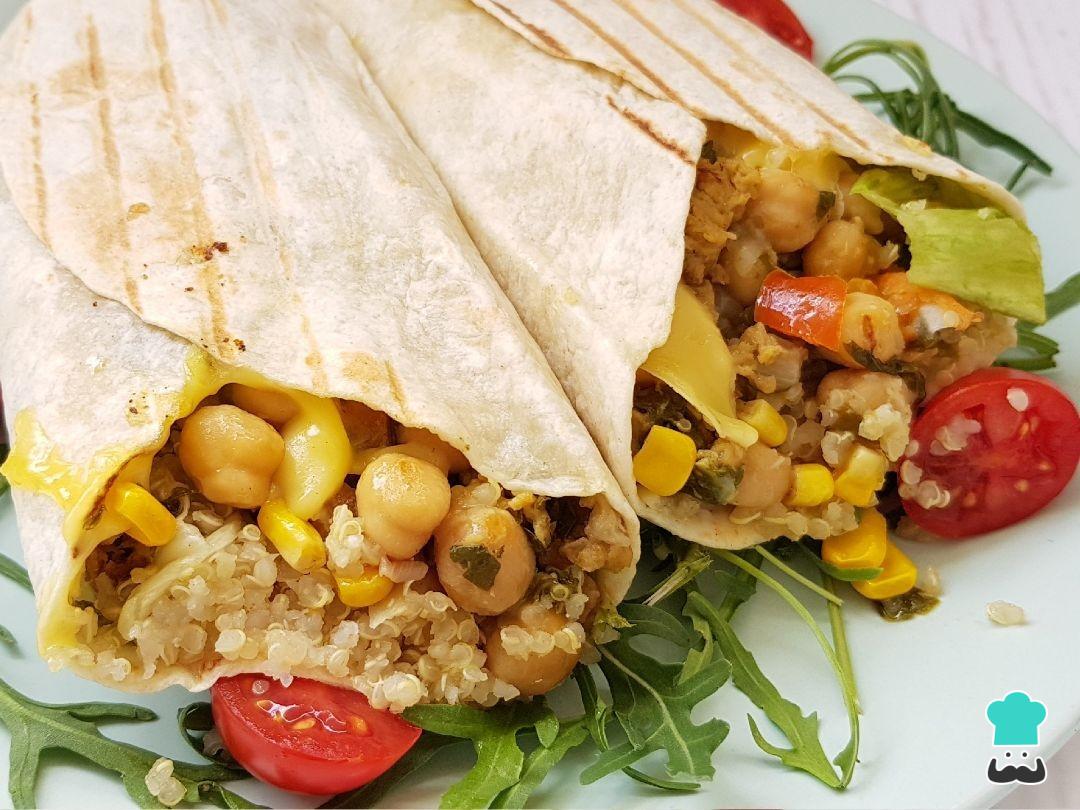 Las fajitas son uno de los platos más tradicionales de la cocina tex-mex. Tradicionalmente se rellenan de tiras de ternera asadas a la parrilla pero hoy en día existen muchas versiones de este platillo, por ejemplo, esta receta de fajitas veganas que comparto en RecetasGratis. Para el relleno vamos a utilizar la quinoa y los garbanzos, dos ingredientes que combinan muy bien y aportan una gran cantidad de proteína vegetal. Para añadir más sabor y textura haremos un rico sofrito de verduras, añadiremos calabaza hecha al horno con romero y tomillo y hojas verdes de lechuga y rúcula. Para el aderezo utilizaremos el tahini o pasta de sésamo. También puedes añadir unas lonchas de queso que se derretirá al calentar la fajita y tendrás un delicioso y sencillo plato al que es muy difícil resistirse.