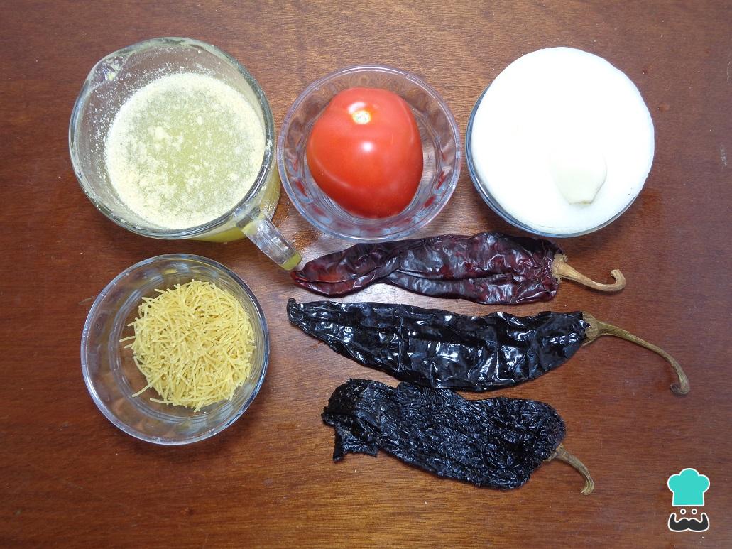 En la siguiente imagen podrás observar los ingredientes que necesitaremos para la preparación de este delicioso fideo seco a los tres chiles.