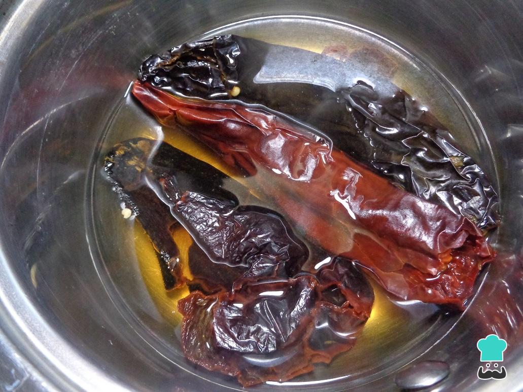 Vamos a comenzar nuestra preparación por poner a suavizar los chiles en agua caliente, antes de esto debemos limpiarlos perfectamente quitándoles semillas y venas. Una vez limpios los colocamos en una cacerola con agua caliente y los dejamos ahí hasta que se piel se sienta suave.