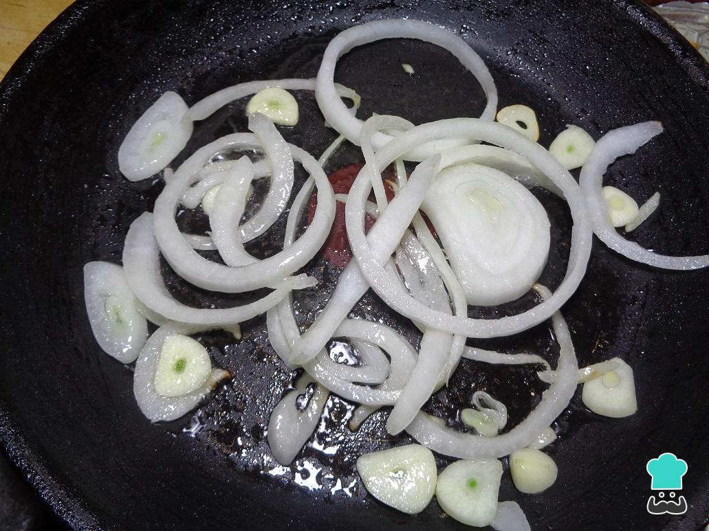 Mientras tanto tomamos la cebolla rebanada junto con el ajo y los ponemos a sofreír en un sartén con aceite previamente calentado.