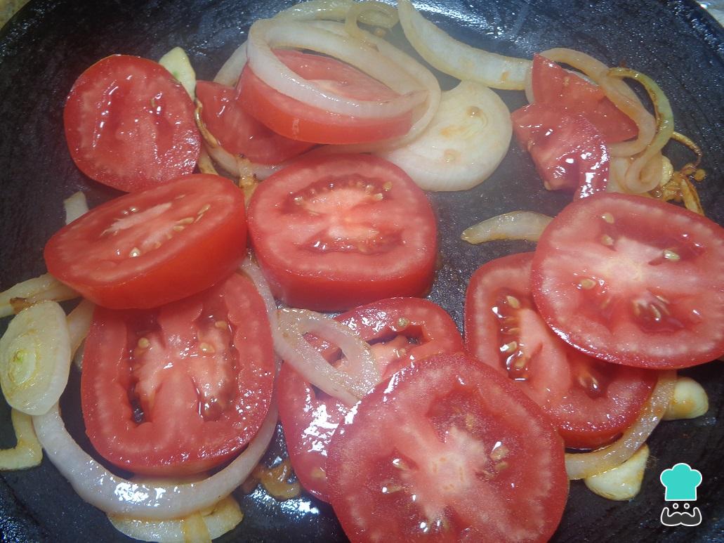 Una vez la cebolla se observe transparente, añadimos el tomate cortado en trozos toscos como se ve en la foto. Mantenemos la cocción del sofrito hasta que la verdura este bien tierna.