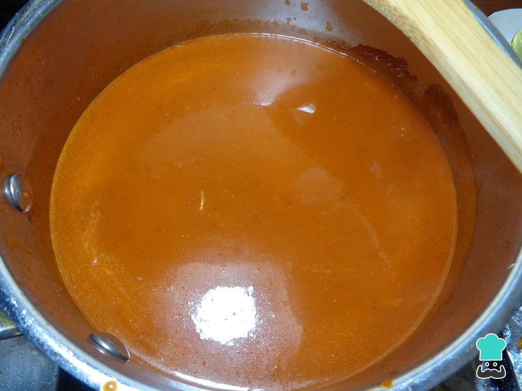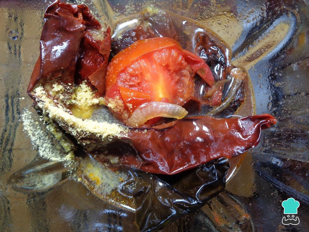 Una vez este listo el sofrito y tengamos los chiles suaves, añadimos todo al vaso de la licuadora junto con la cebolla, el ajo, el caldo de pollo y una pizca de sal para hacer la salsa.