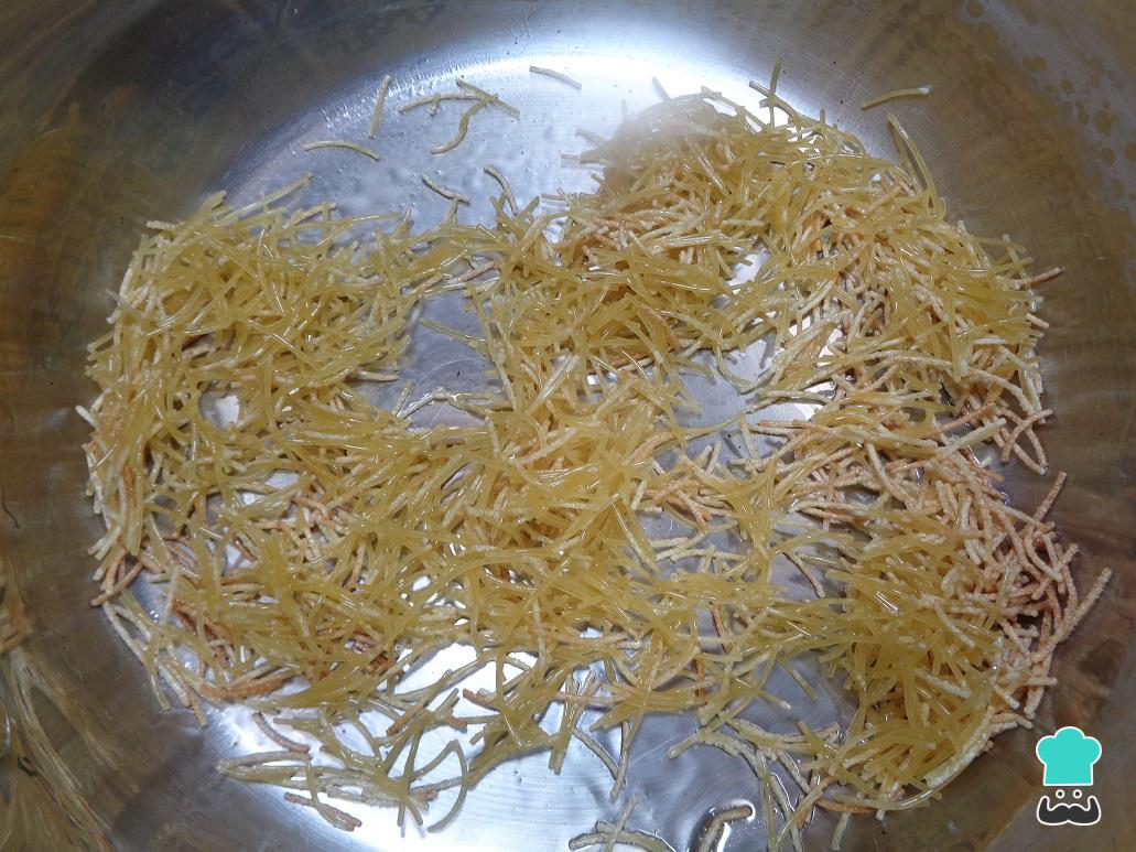 Por otro lado tomamos la pasta de fideo y la colocamos en una cacerola con un poco de aceite previamente calentado. Dejamos entonces dorar los fideos ligeramente, removiendo con frecuencia para evitar que se quemen.