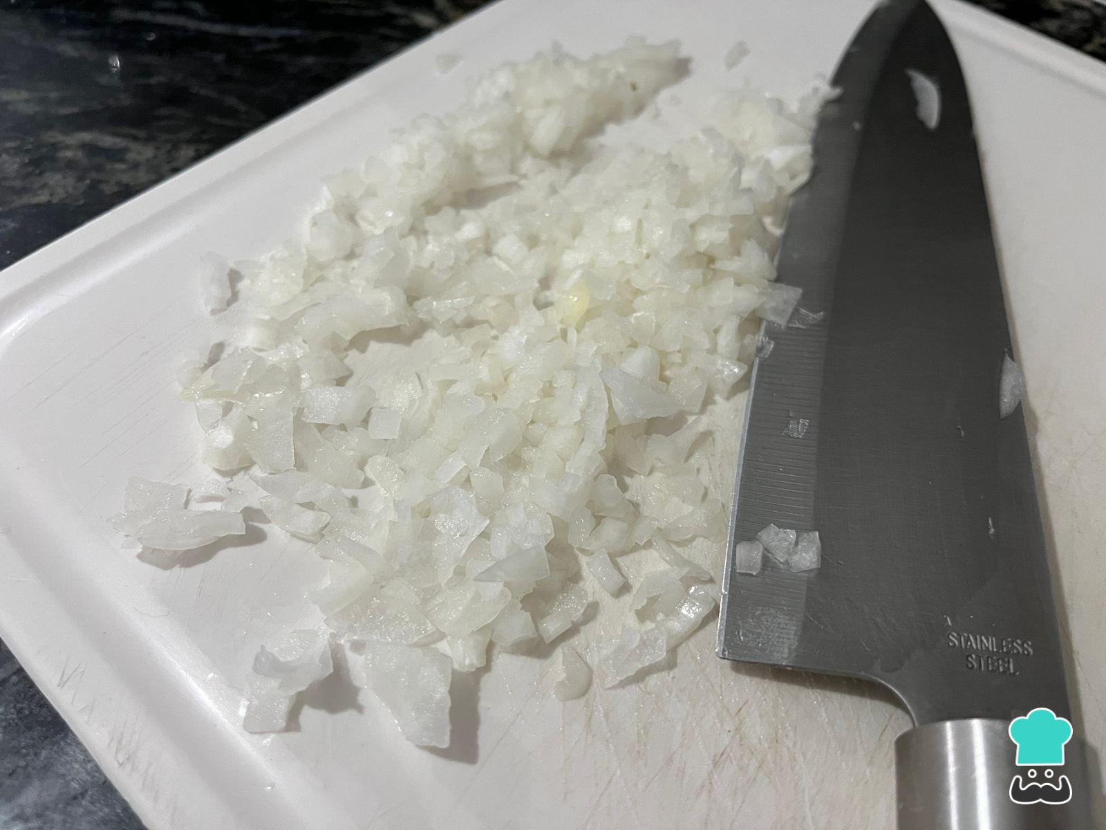 Para empezar con la preparación de los fideos con atún, pela y pica la cebolla para saltearla en una sartén con una cucharadita de aceite.