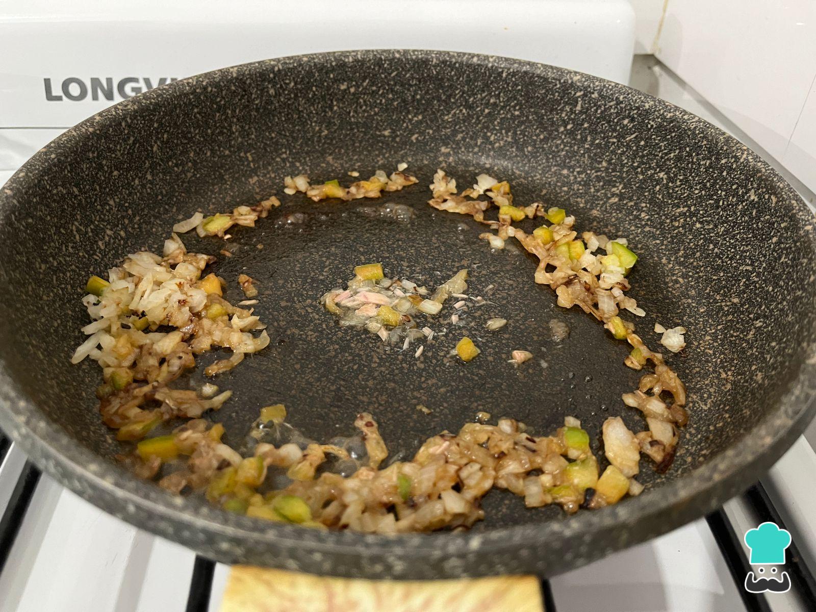 Cuando la cebolla empiece a tomar color, añade el morrón limpio picado en cubos y sin sus semillas. Baja el fuego al medio y añade unas cucharadas de agua caliente para levantar el fondo de cocción. Repite unas 2 o 3 veces hasta que las verduras estén bien cocidas.