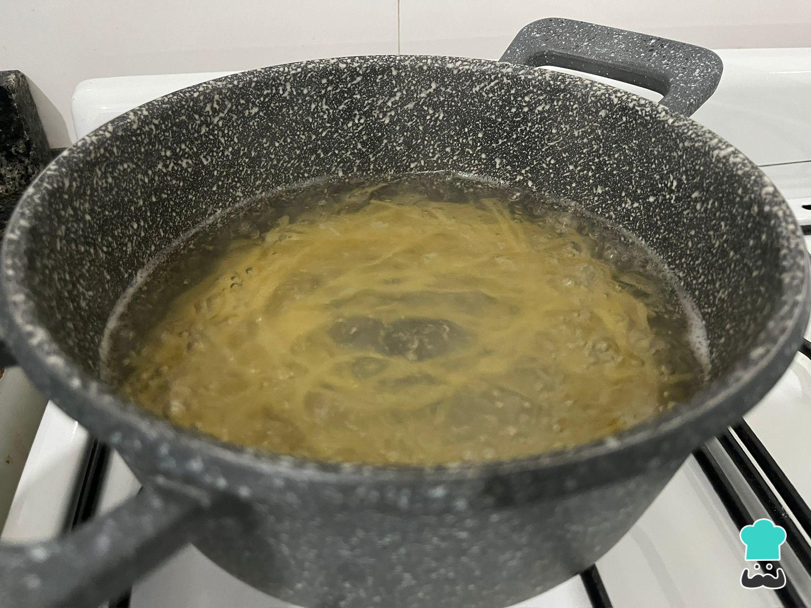 Mientras, hierve abundante agua para cocinar en ella la pasta seca por unos 9 minutos o según la indicación del paquete.