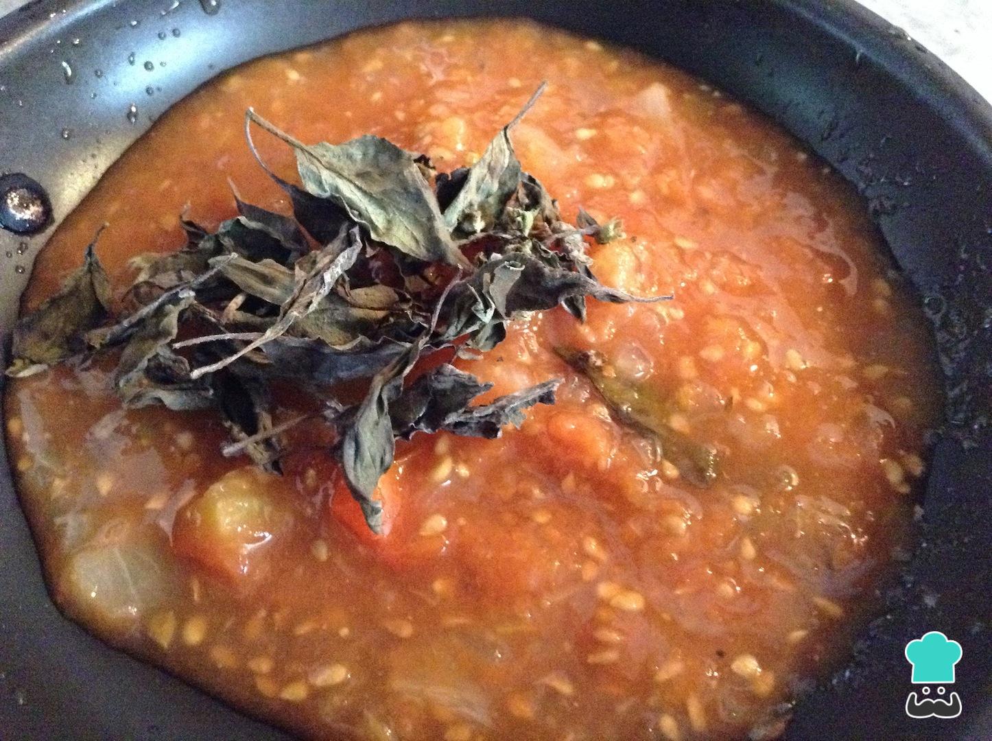 En una sartén adiciona la salsa napolitana con la albahaca seca y lleva a fuego medio durante 10 minutos aproximadamente. Lo ideal es que estos dos ingredientes se infusionen de manera correcta.