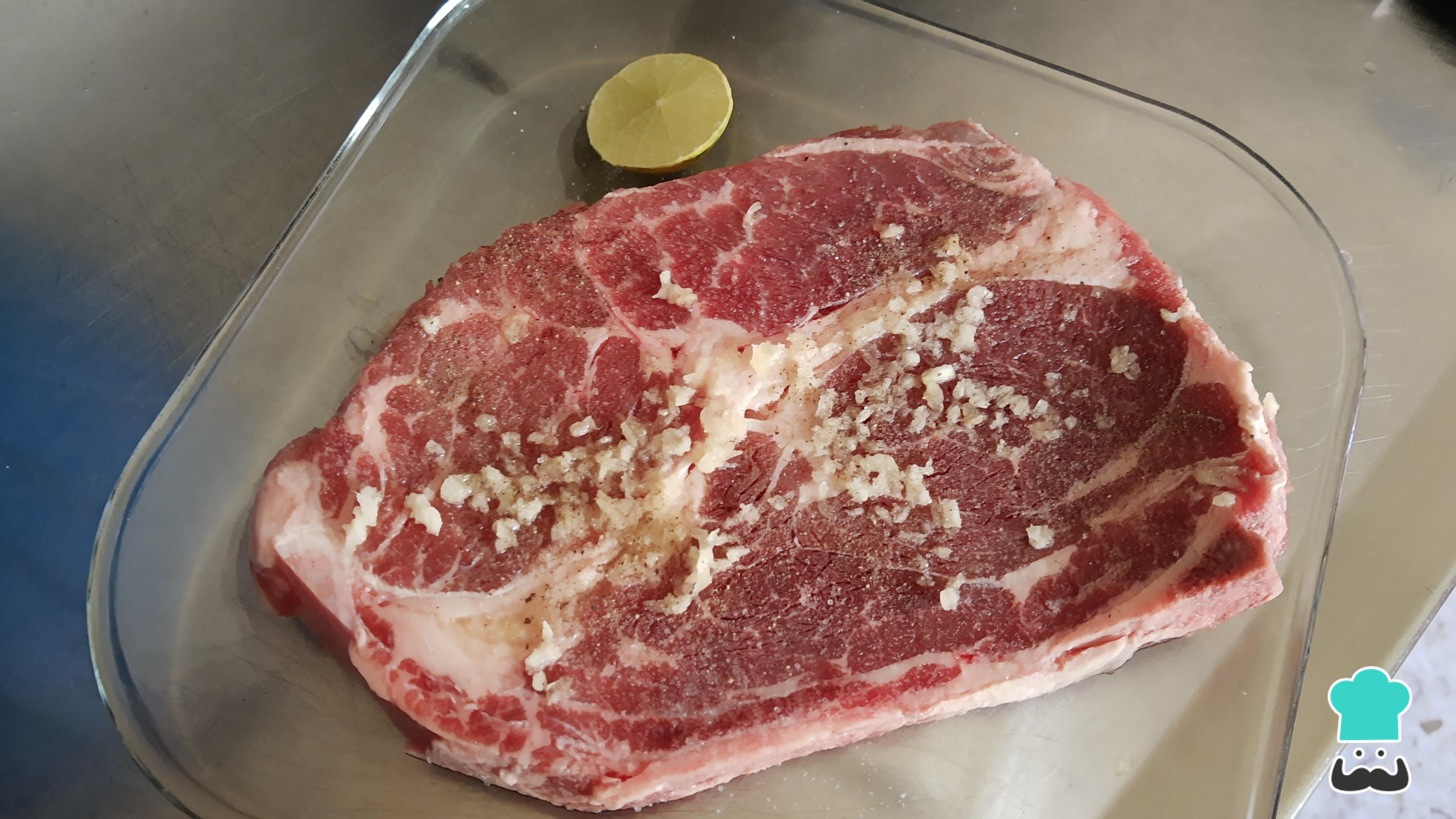 Empieza la receta de filete a la tampiqueña sazonando la carne. Debes saber que puedes utilizar filete de lomo de res, bistec a la tampiqueña, rib eye o top sirloin. Así pues, agrega un poco de sal y pimienta al gusto y un poco de jugo de limón seguido de ajo picado finamente. Deja reposar mientras continuas con la receta.