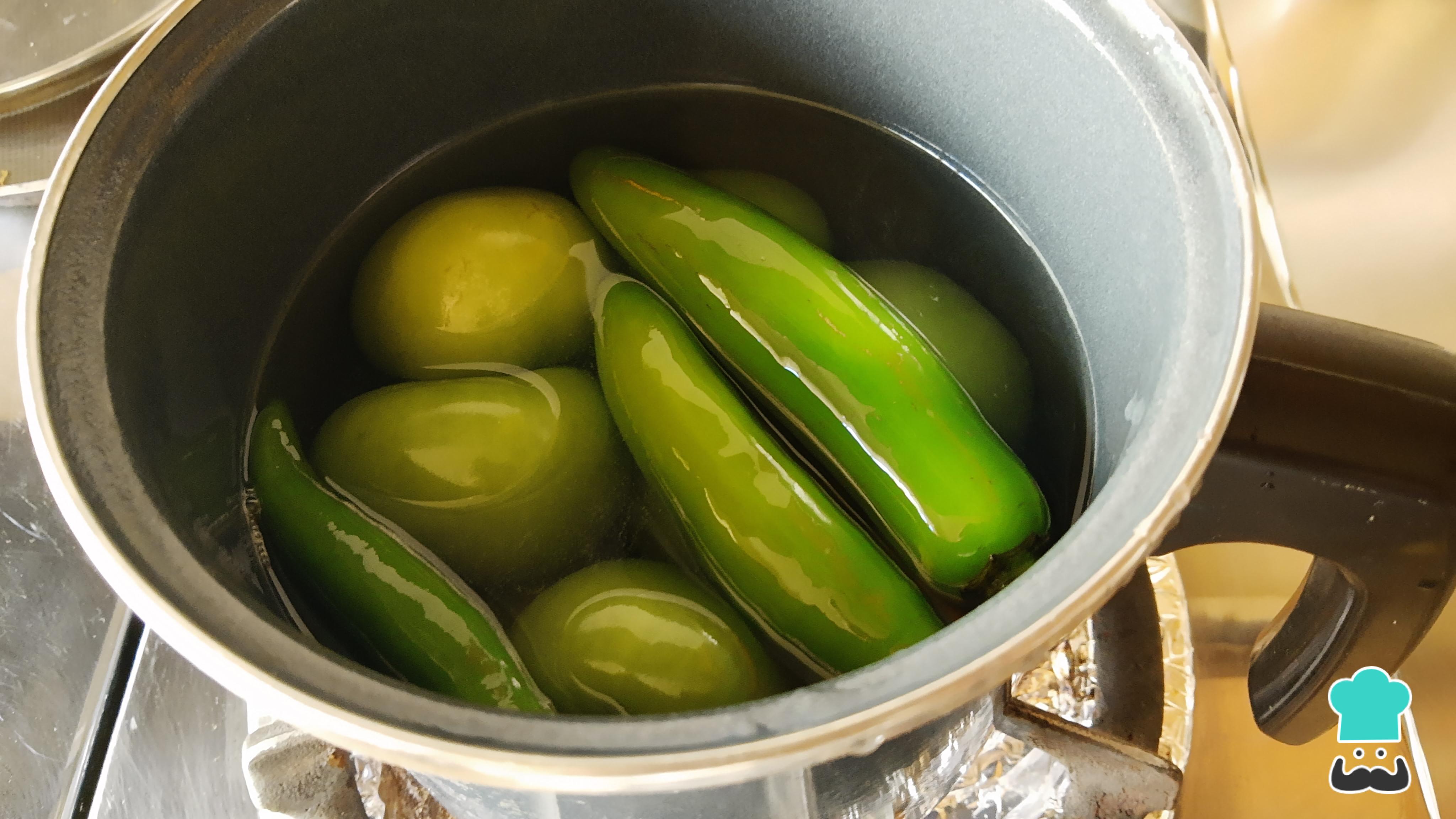 Prepara la salsa de las enchiladas, para ello, hierve los tomates verdes y los chiles en una olla con suficiente agua durante 5 minutos.