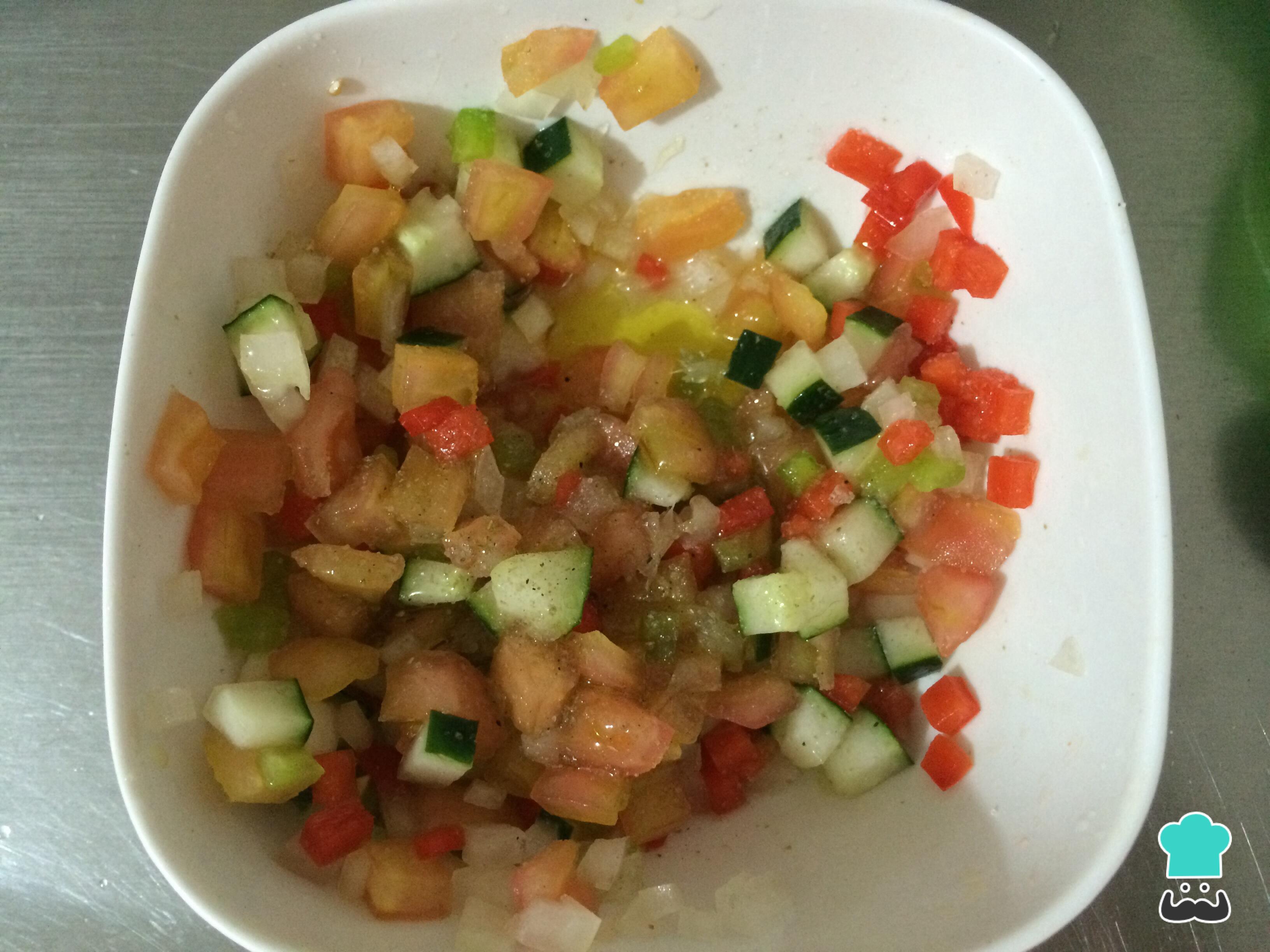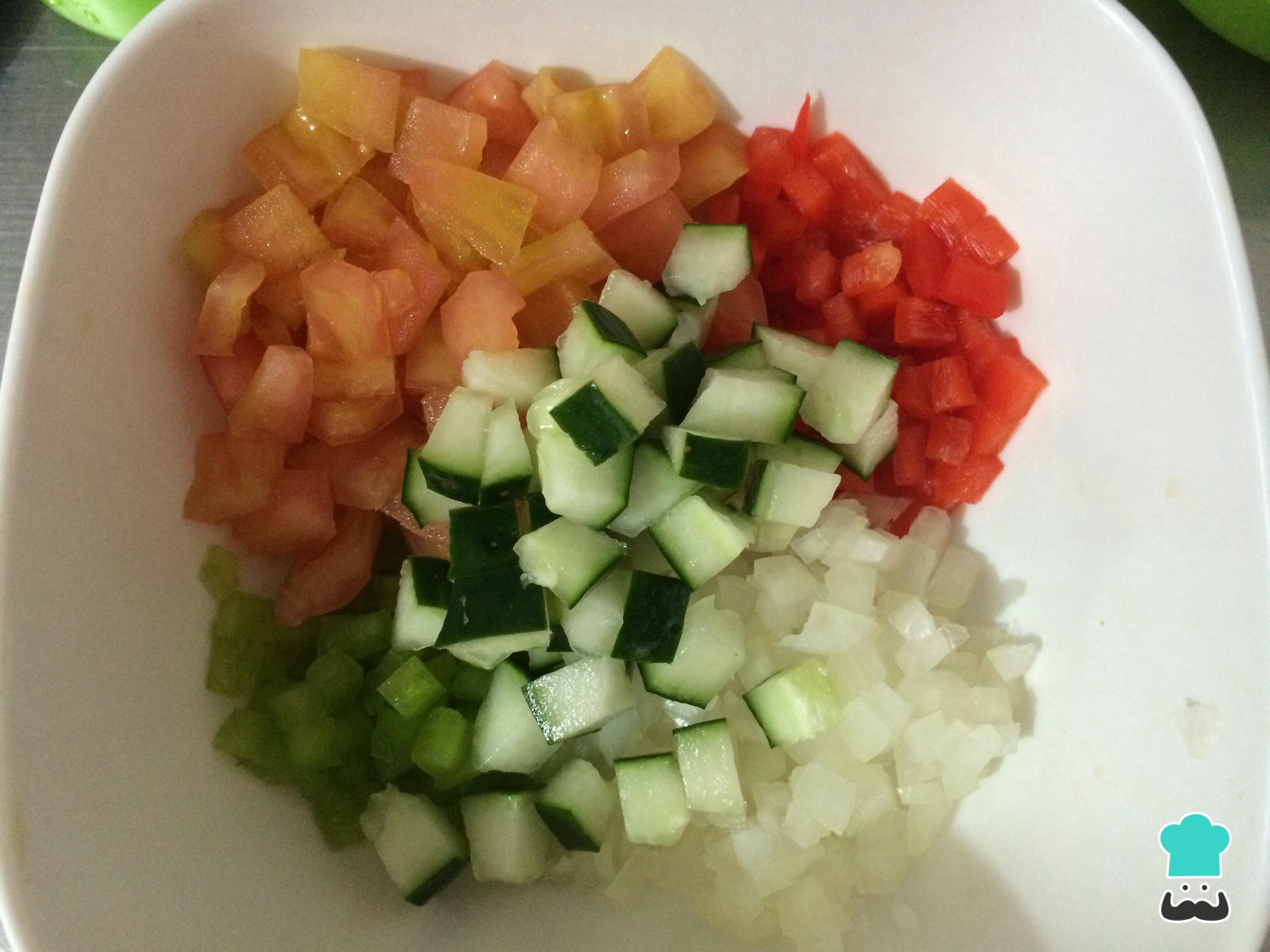 Cortar en cubos pequeños el pepino sin semillas, el tomate sin semillas, la cebolla blanca y los pimientos sin piel.