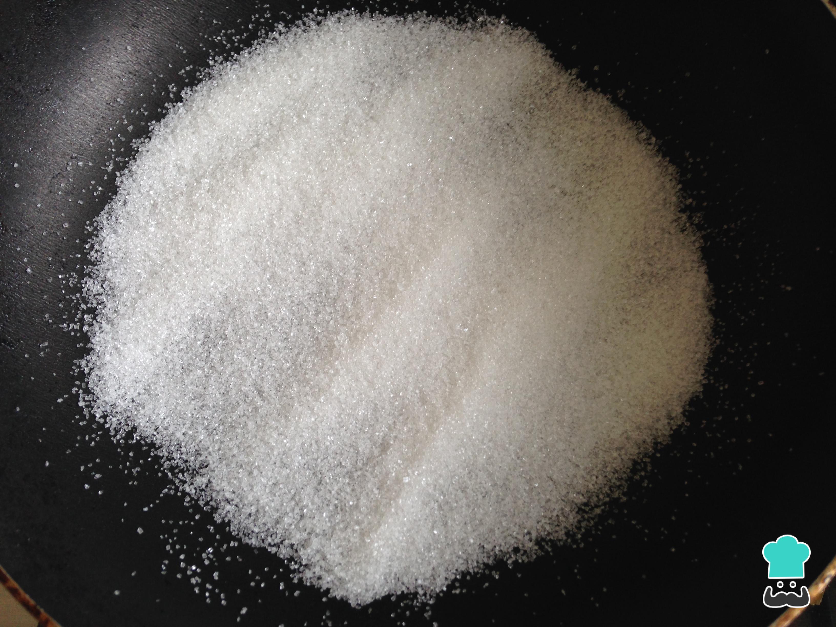 Una vez listos los ingredientes, empezamos por la elaboración del caramelo. Para ello, colocamos los 100 gramos de azúcar en una sartén. Cuando observemos que comienza a derretirse, movemos con una espátula o cuchara de madera hasta que se convierta en caramelo líquido.