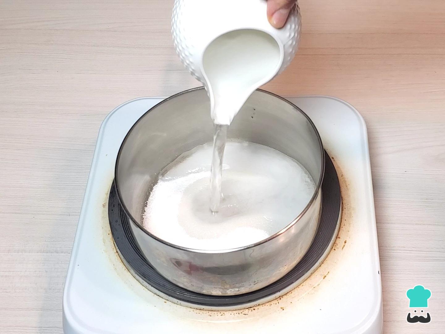 Coloca a fuego medio-alto y sin remover, deja que el almíbar se cocine hasta que tome un color ligeramente dorado. Cuando comience a dorarse, retíralo inmediatamente del fuego y cuidadosamente viértelo en un molde apto para resistir altas temperaturas que debe estar caliente. Así, podrás distribuir el caramelo rápidamente y de manera uniforme.