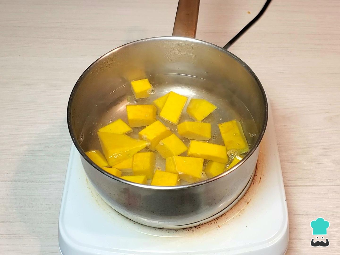 Para el flan de calabaza de la abuela, empieza pelando, retirando las semillas y cortando la calabaza en trozos medianos. No es necesario que sean regulares, ya que luego los triturarás. Cocina los trozos de calabaza en una cacerola con agua durante unos 5 minutos o hasta que se puedan pinchar fácilmente y estén suaves. Luego, resérvalos aparte.