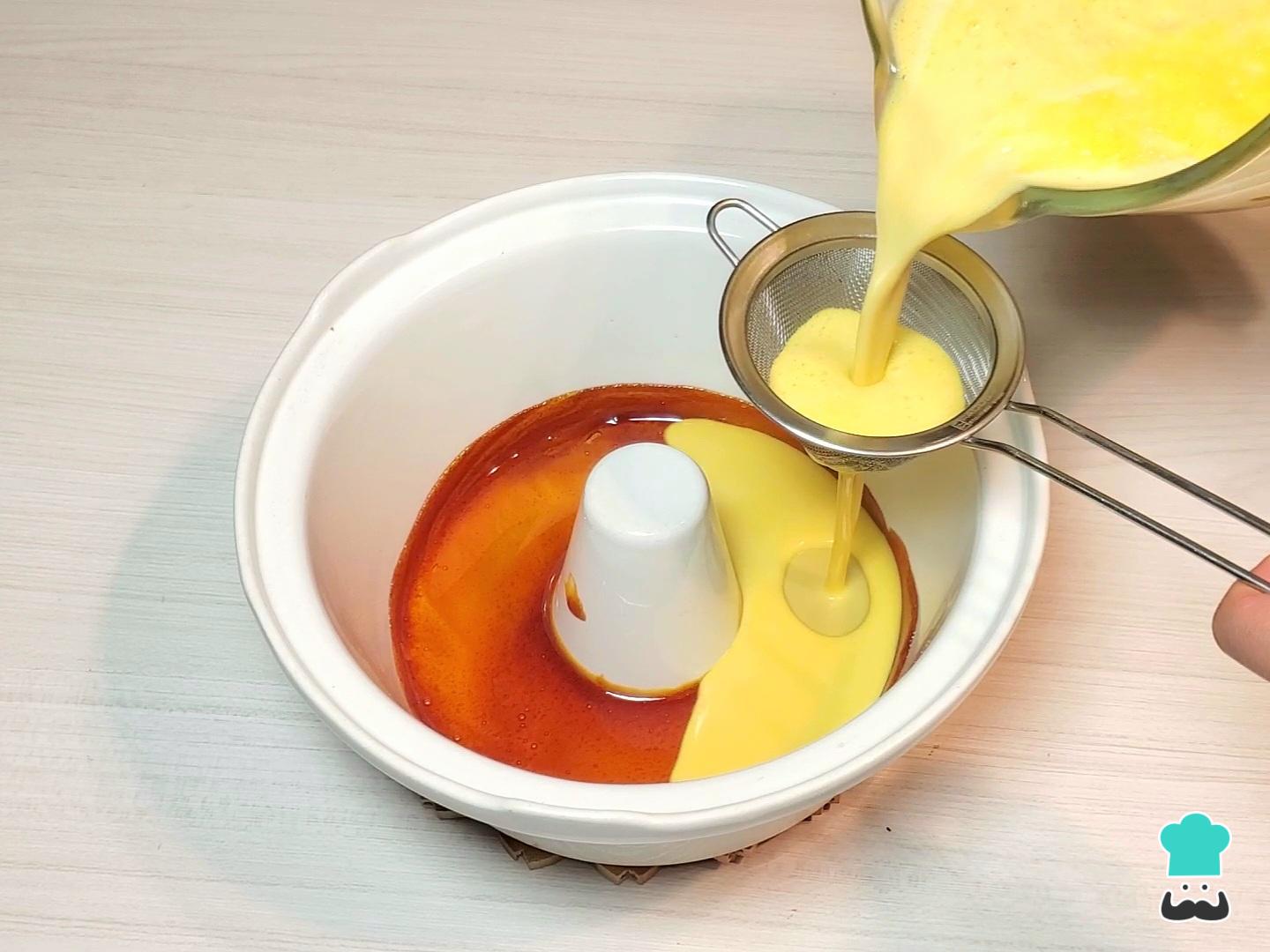 Vierte la mezcla en el molde con caramelo colándola para retirar cualquier fibra de la calabaza o residuo del huevo.