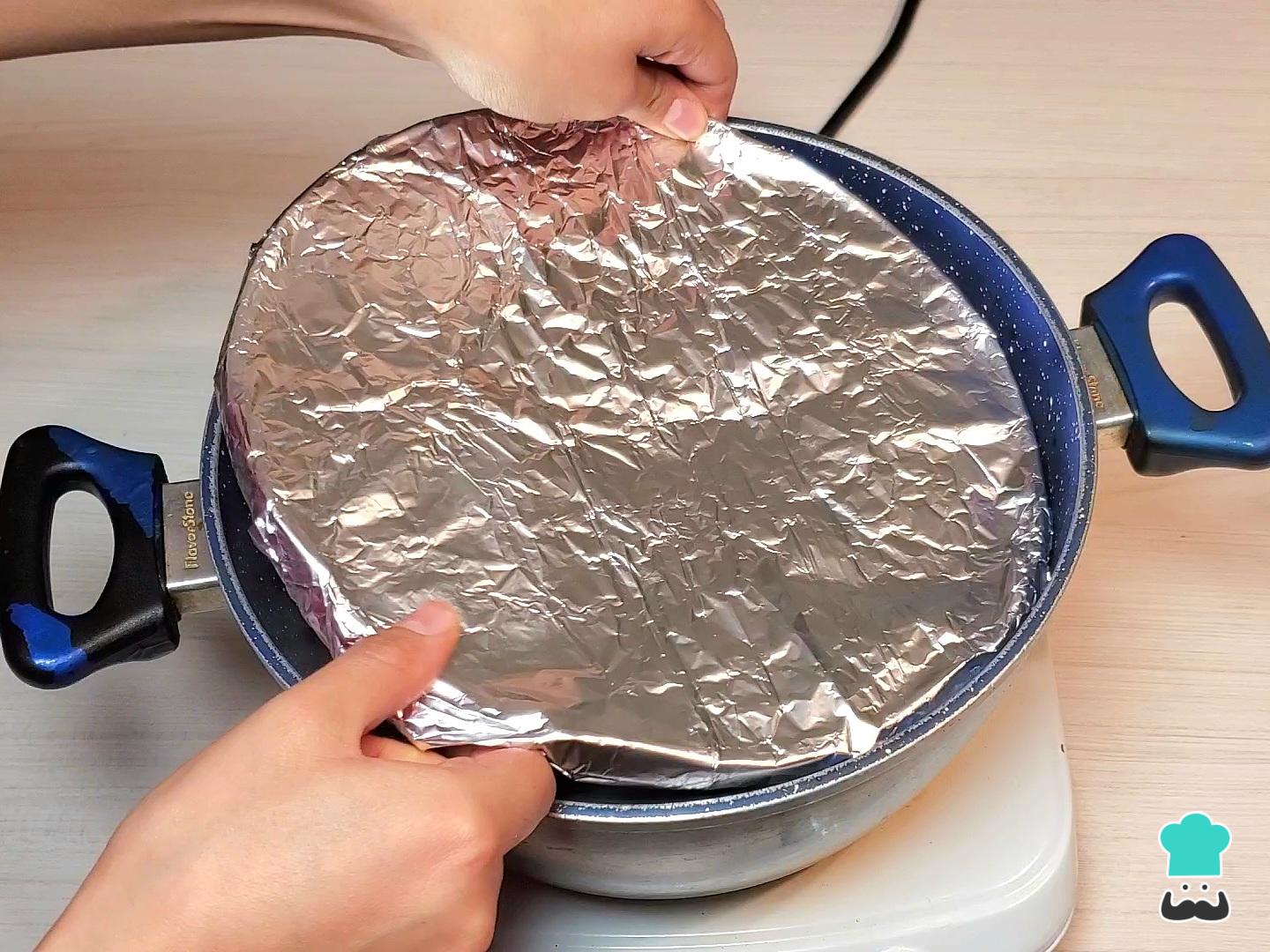 Cubre el molde con papel aluminio y cocínalo en una olla con agua a fuego medio-bajo durante unos 45 minutos, o hasta que, al introducir un palillo, este salga completamente limpio.