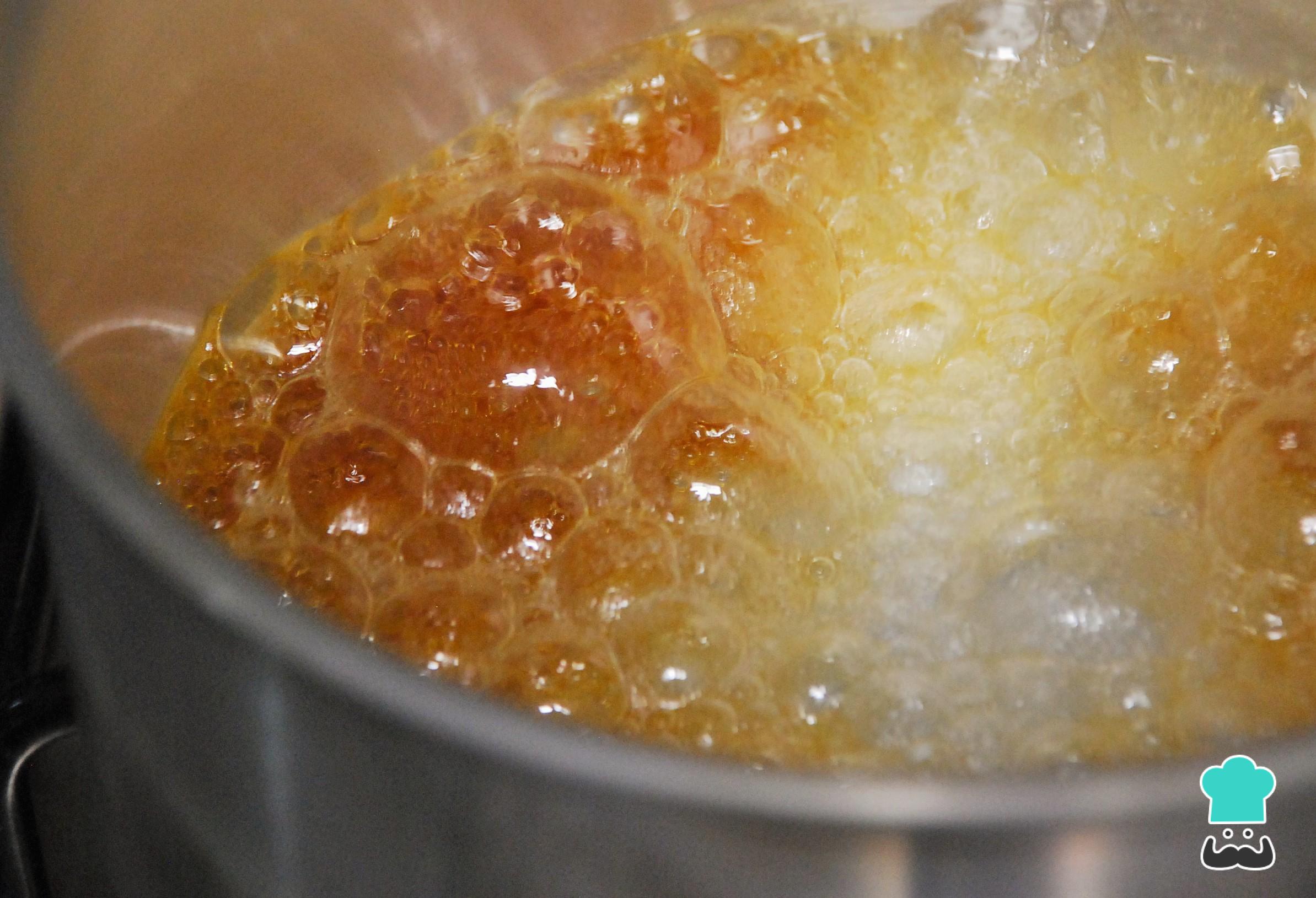 A continuación, se pone a calentar una cacerola u olla pequeña a fuego medio y se agrega el azúcar moreno. Tenemos que ir removiendo continuamente hasta que este se derrita y se haga un caramelo líquido.