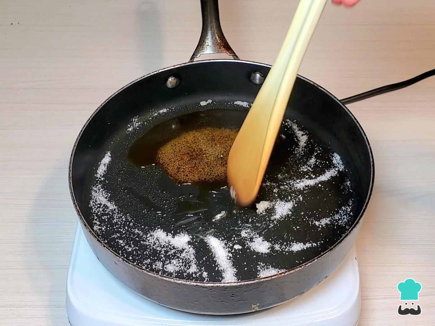 Empieza preparando un caramelo seco. Para hacerlo, coloca una sartén sobre el fuego y vierte el azúcar dejando caer en forma de lluvia para que se esparza por toda la sartén. Mantén en el fuego sin mover hasta que empiece a derretirse. Luego, con una cuchara de palo resistente a altas temperaturas, comienza a remover para que todo el azúcar se derrita de forma uniforme sin llegar a quemarse.