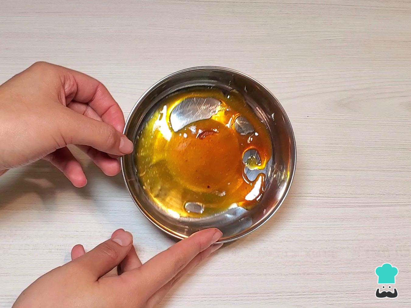 Cuando el caramelo tome un color dorado, retíralo inmediatamente del fuego y viértelo en un molde apto para la freidora de aire. Cuidadosamente, gira el molde para distribuir el caramelo por toda la base y, si es posible, por las paredes. Si el caramelo se ha endurecido, calienta el molde sobre el fuego hasta que vuelva a ponerse líquido. Una vez cubierto, deja enfriar y reserva.