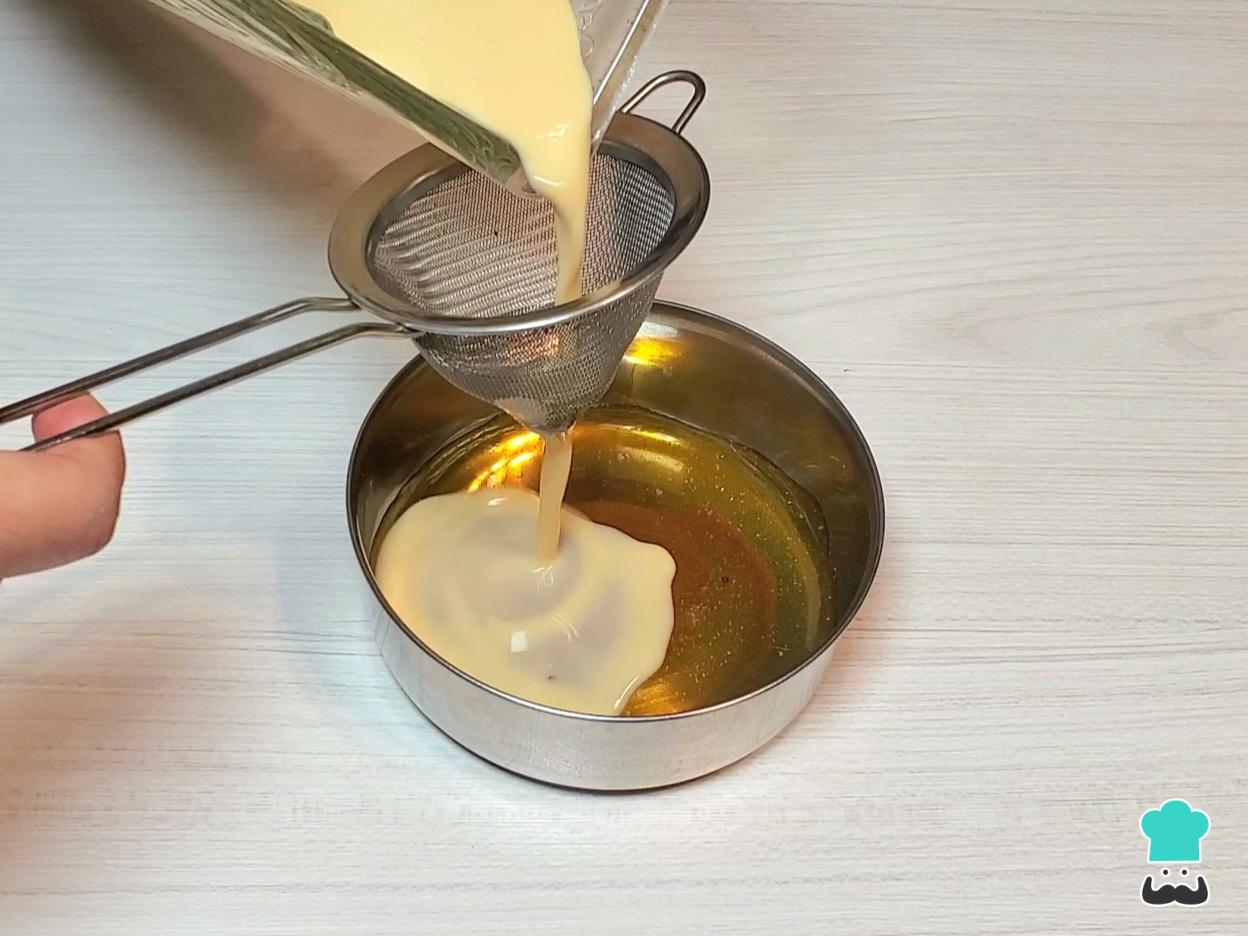 Tritura por unos segundos hasta que el azúcar se disuelva por completo y, luego, viértelo en el molde sobre el caramelo, colando para retirar cualquier residuo.