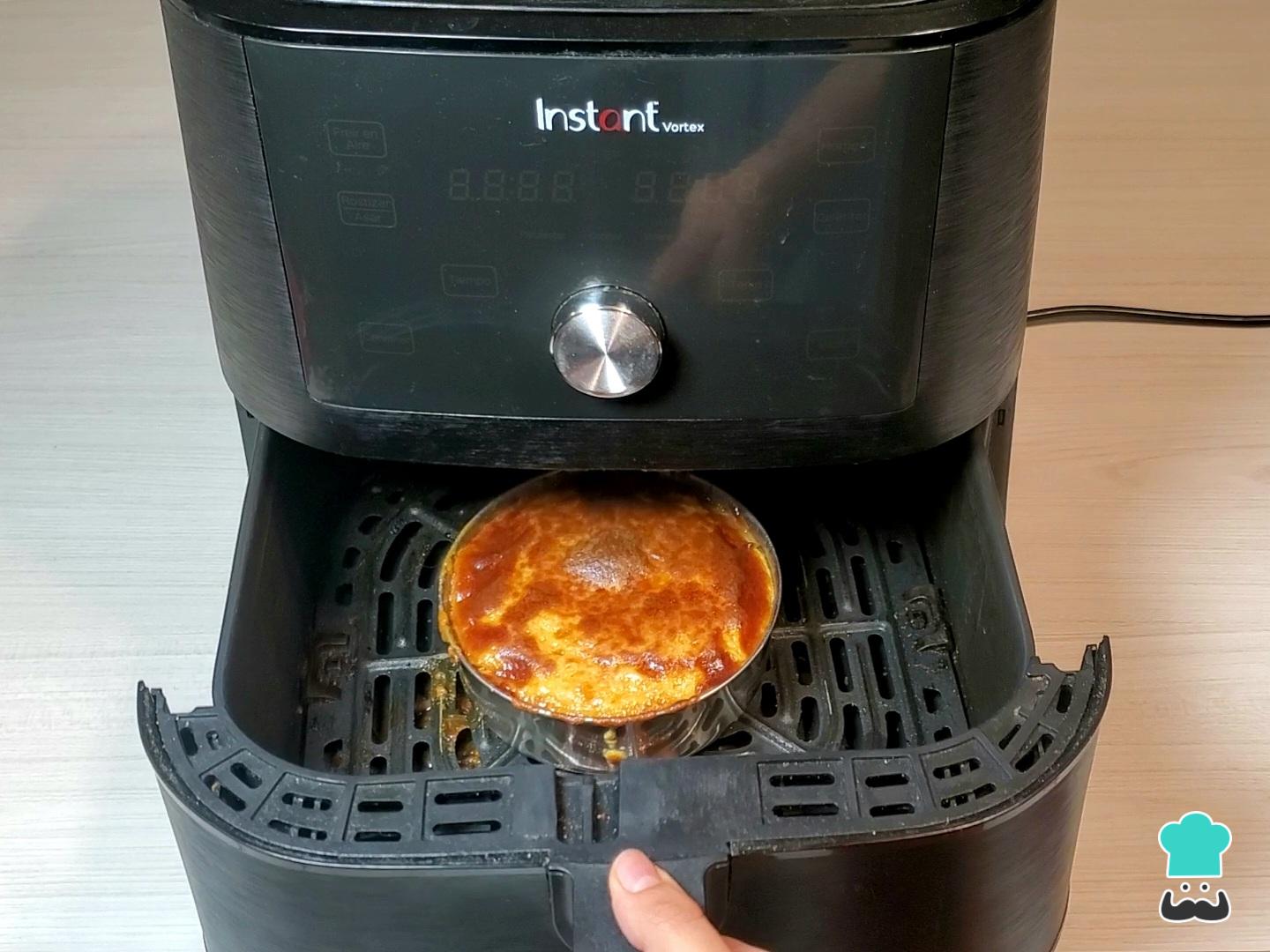 Coloca cuidadosamente este molde de flan de huevo dentro de la freidora de aire y marca a una temperatura de 170 °C por 9 min. Deja cocinar y, cuando esté listo, retíralo de la freidora y déjalo enfriar.