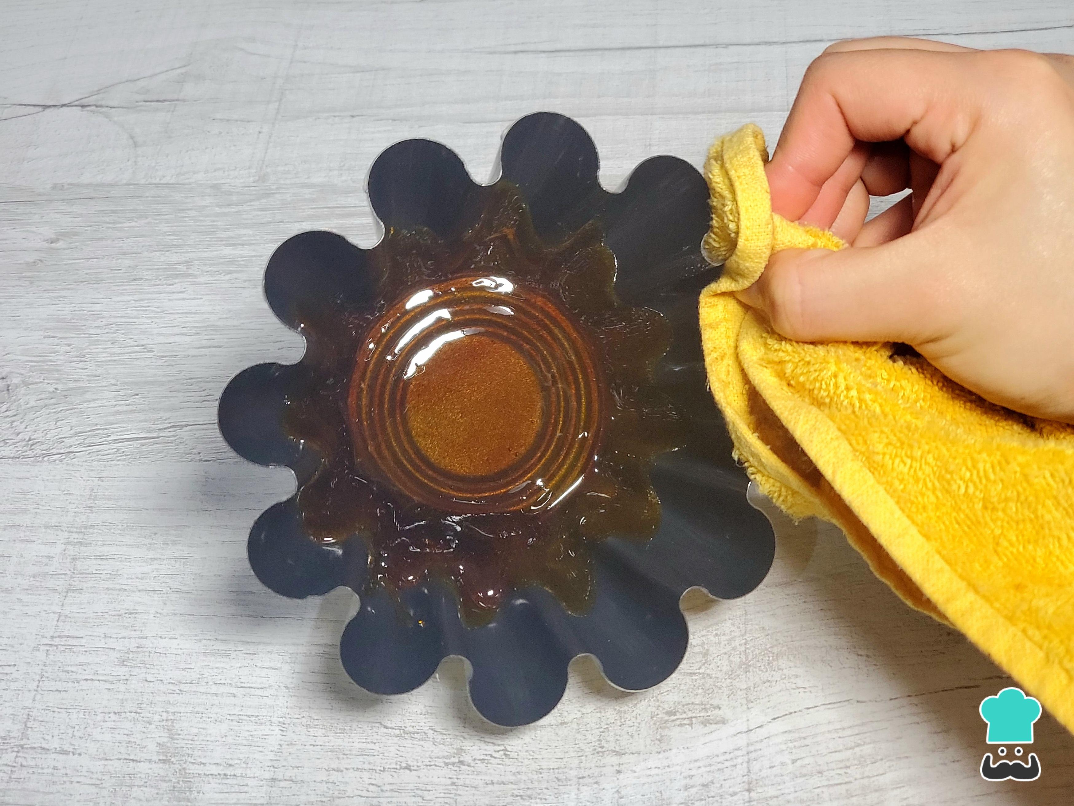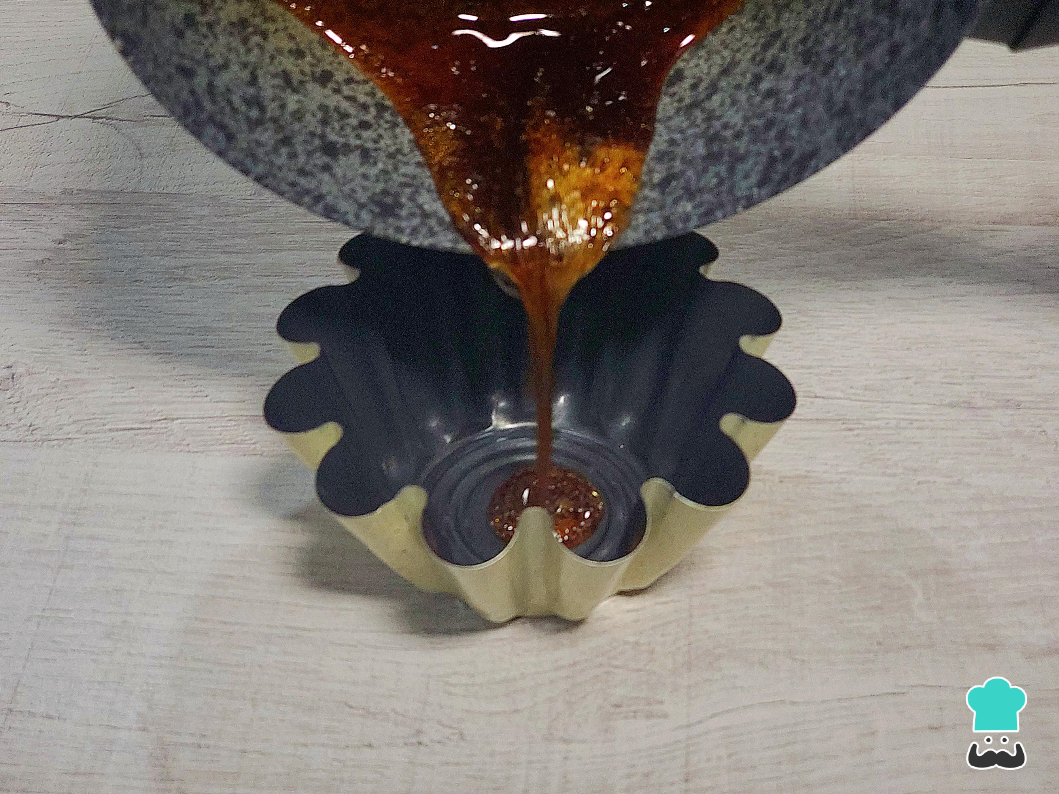 Vuelca el caramelo en el molde, que debe ser apto para resistir altas temperaturas, y remueve cuidadosamente para cubrir tanto la base como mitad de las paredes. Deja enfriar.