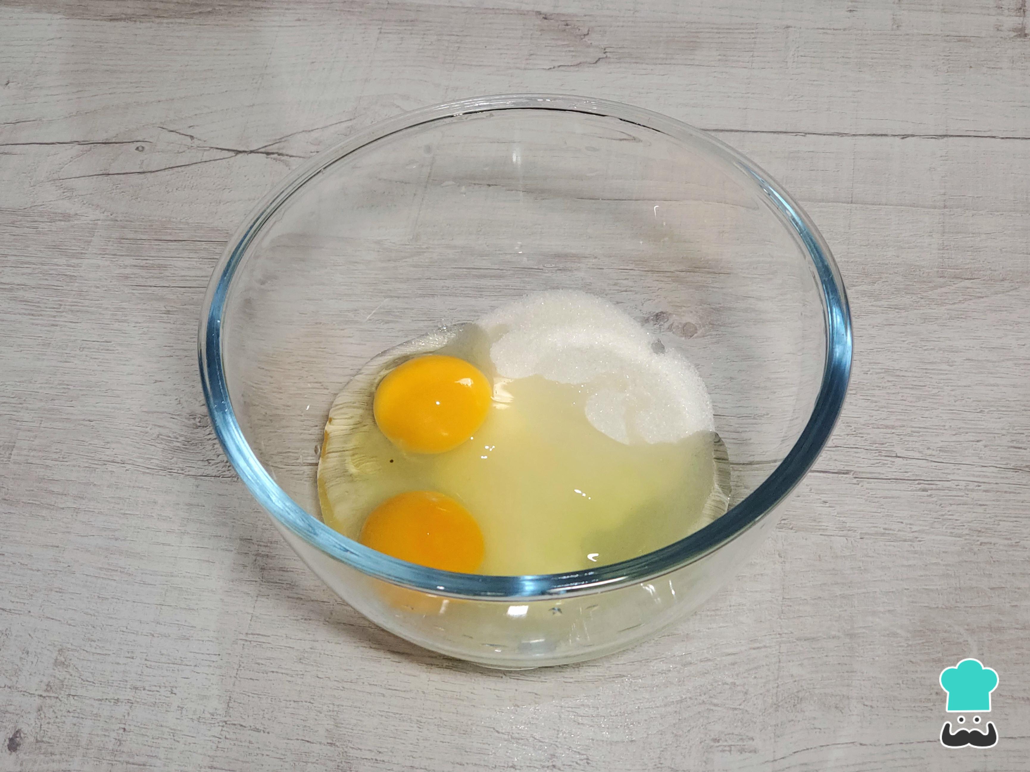 Aparte, para hacer la crema coloca en un bowl los huevos y el azúcar, bate bien utilizando un batidor de globo. No hace falta formar mucha burbuja, ya que esta espuma es la que aporta textura grumosa al flan.