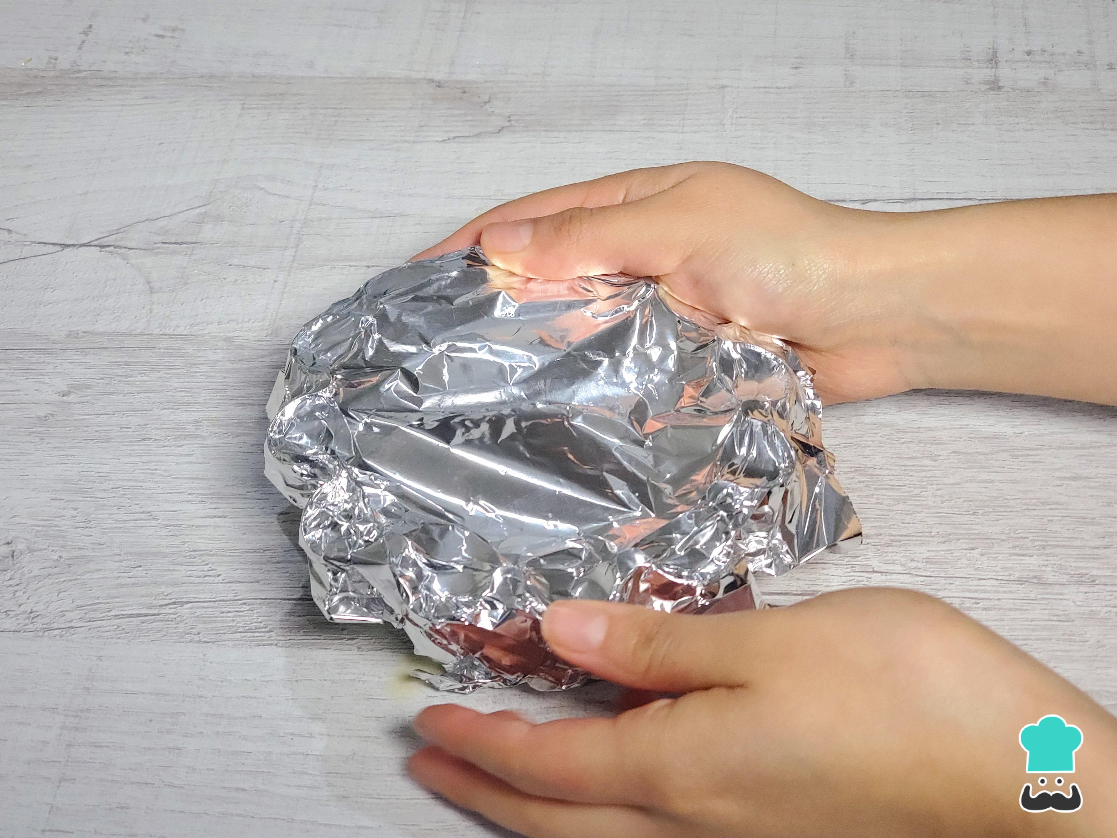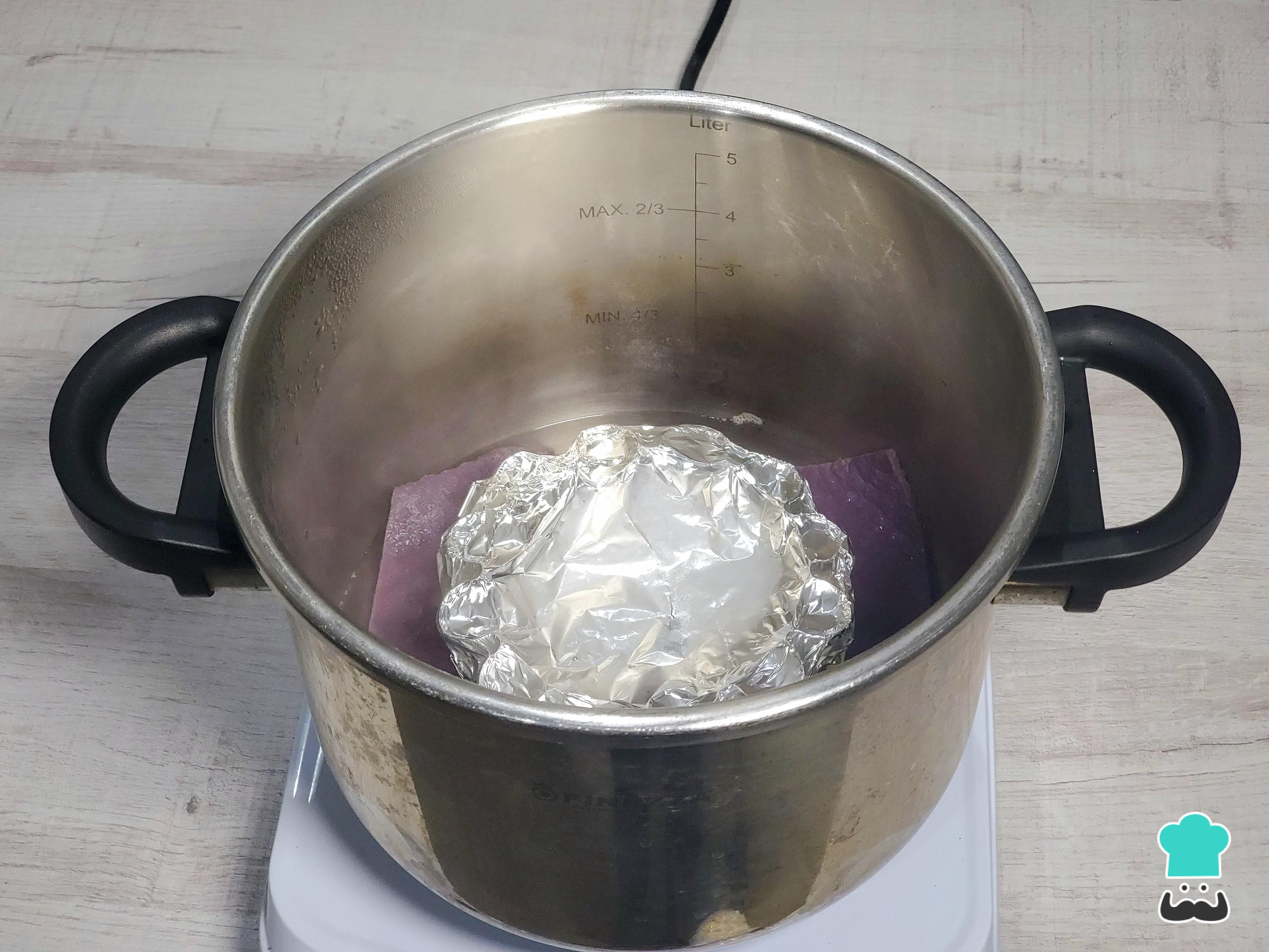 Cubre el molde con papel aluminio y colócalo dentro de una olla a presión. Esta también debe tener un dedo de agua para que se cocine a baño María.