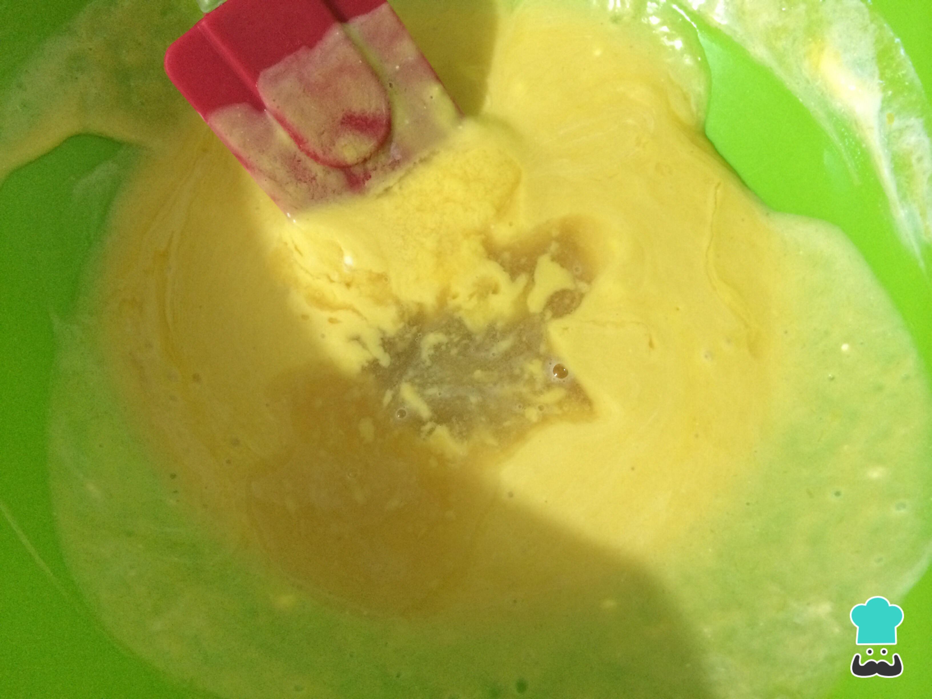 Añadir las claras batidas a la mezcla, revolver con movimiendo envolventes (para evitar que se baje el aire de las claras), hasta obtener una mezcla homogénea.