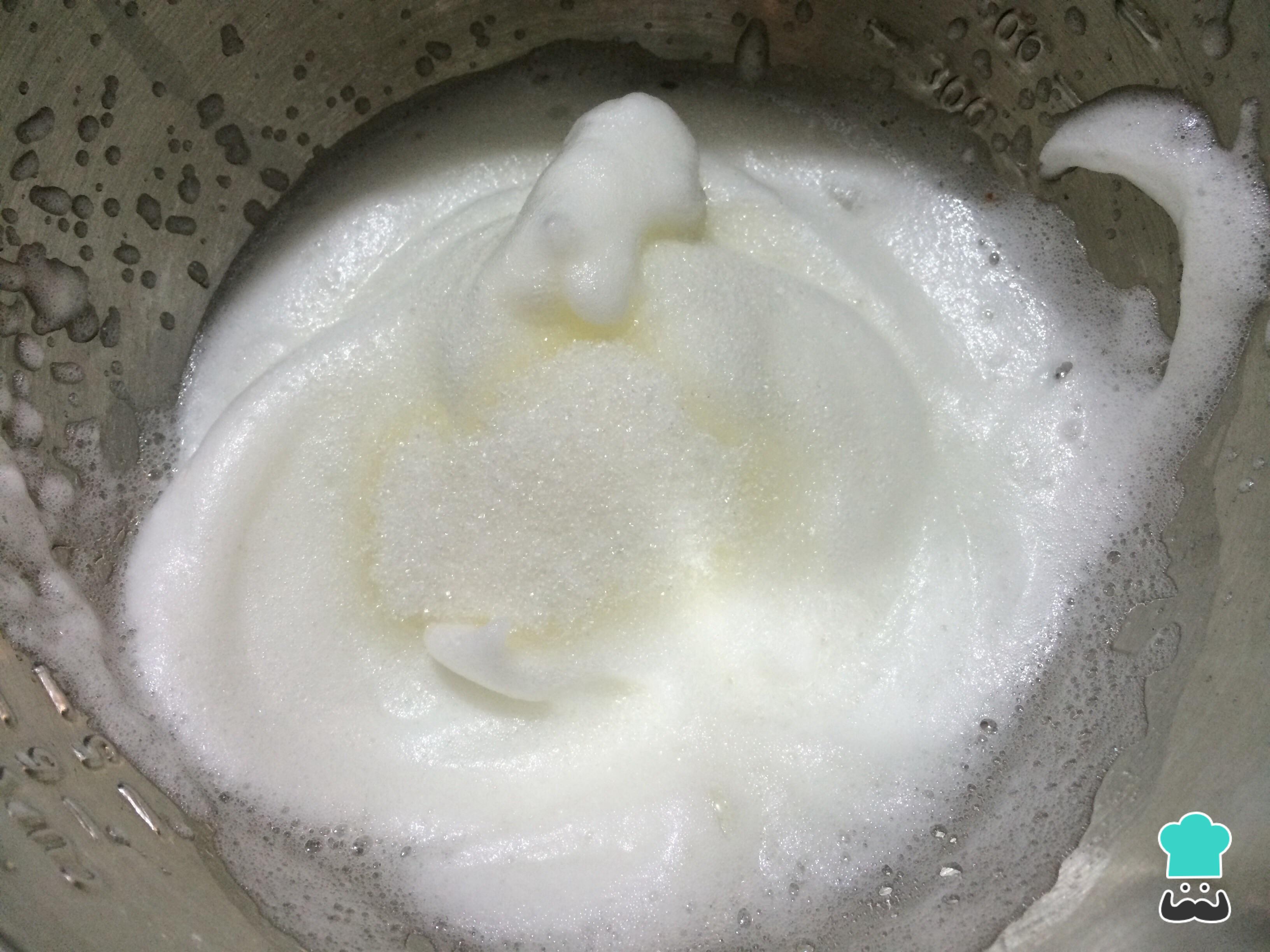 Batir las claras de huevo hasta punto de nieve, agregar el azúcar y volver a batir hasta obtener una mezcla homogénea y aireada.
