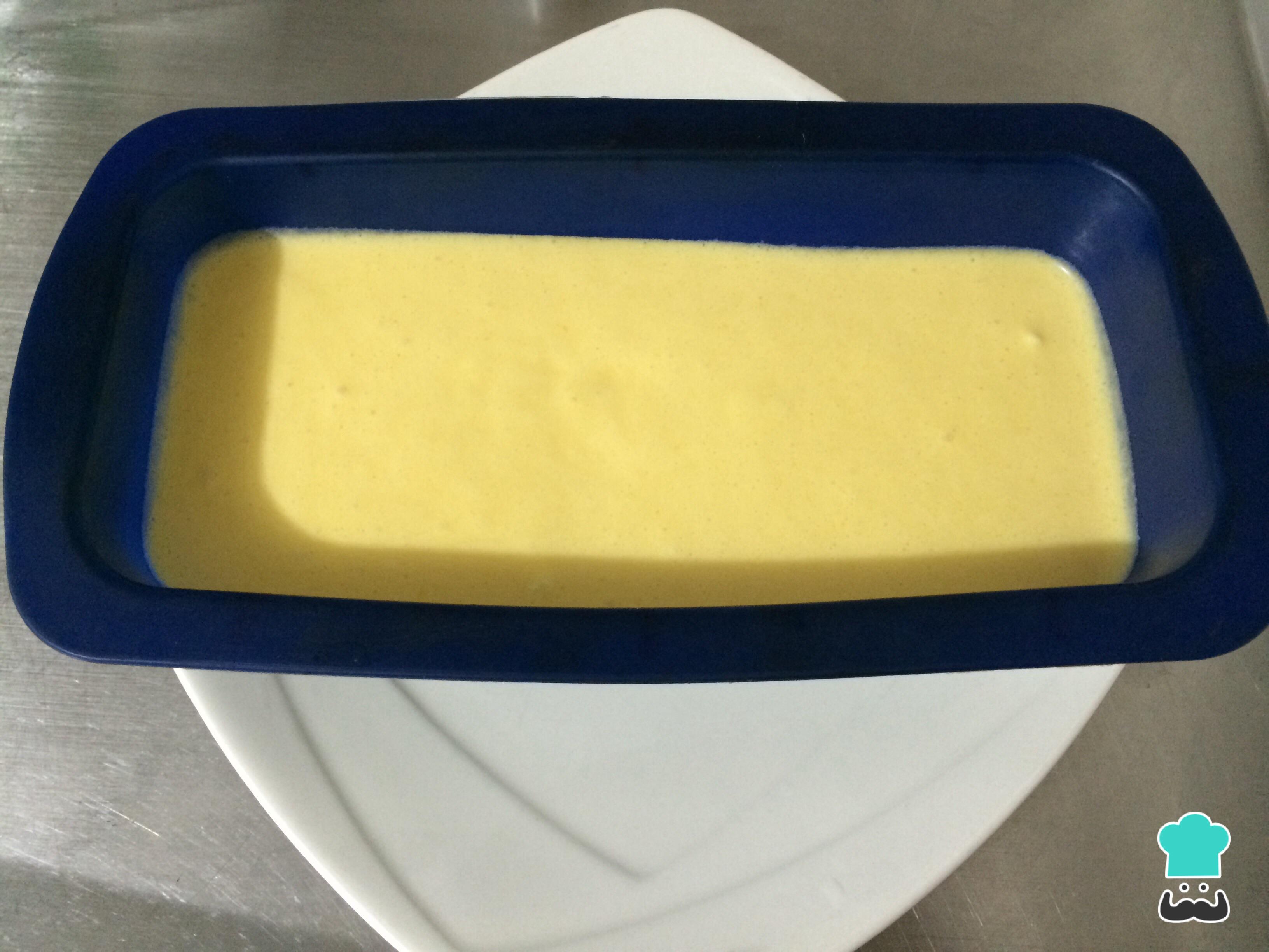 Añadir la mezcla de flan de mango a un molde de silicona, llevar a la nevera mínimo 3 horas para que compacte bien.