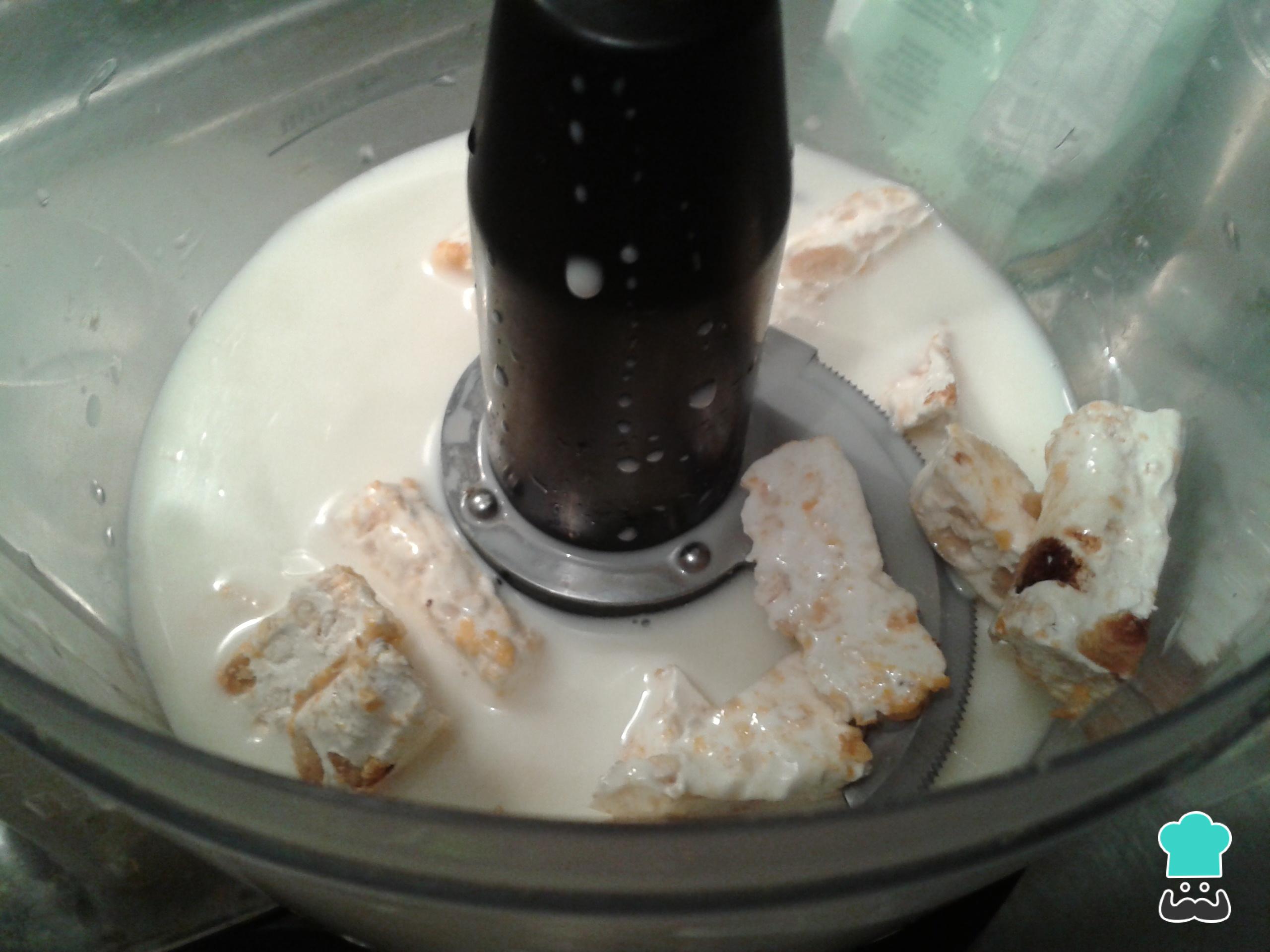 Empezamos por triturar el turrón junto con la leche. Coloca el turrón troceado o partido en piezas más pequeñas en un procesador de alimentos y añade la leche para formar una pasta.
