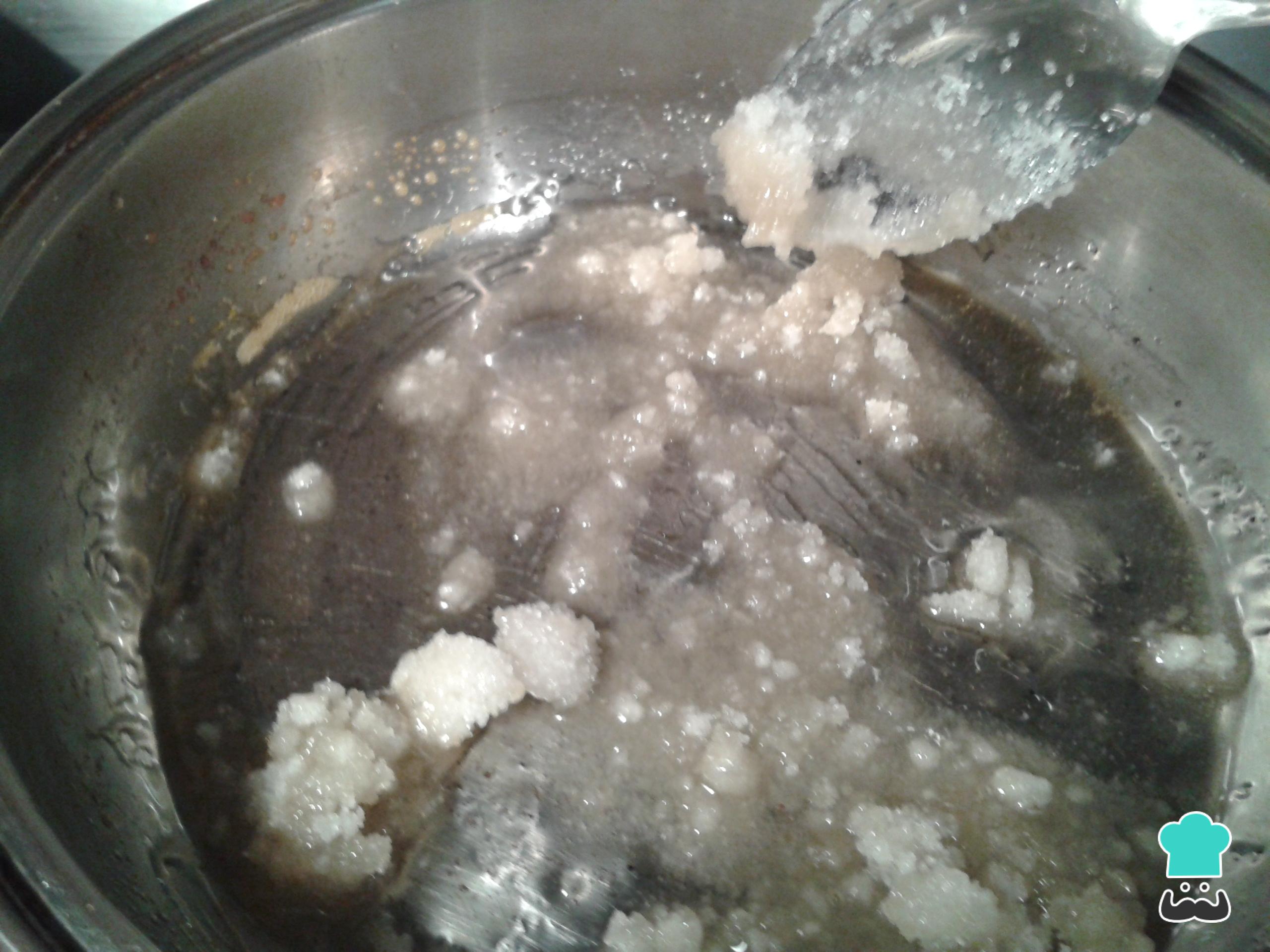 Mientras, en otra sartén hacemos el caramelo para el flan. Coloca el azúcar con unas gotas de agua y calienta hasta que se funda. Si tienes duda, consulta la receta de caramelo líquido.