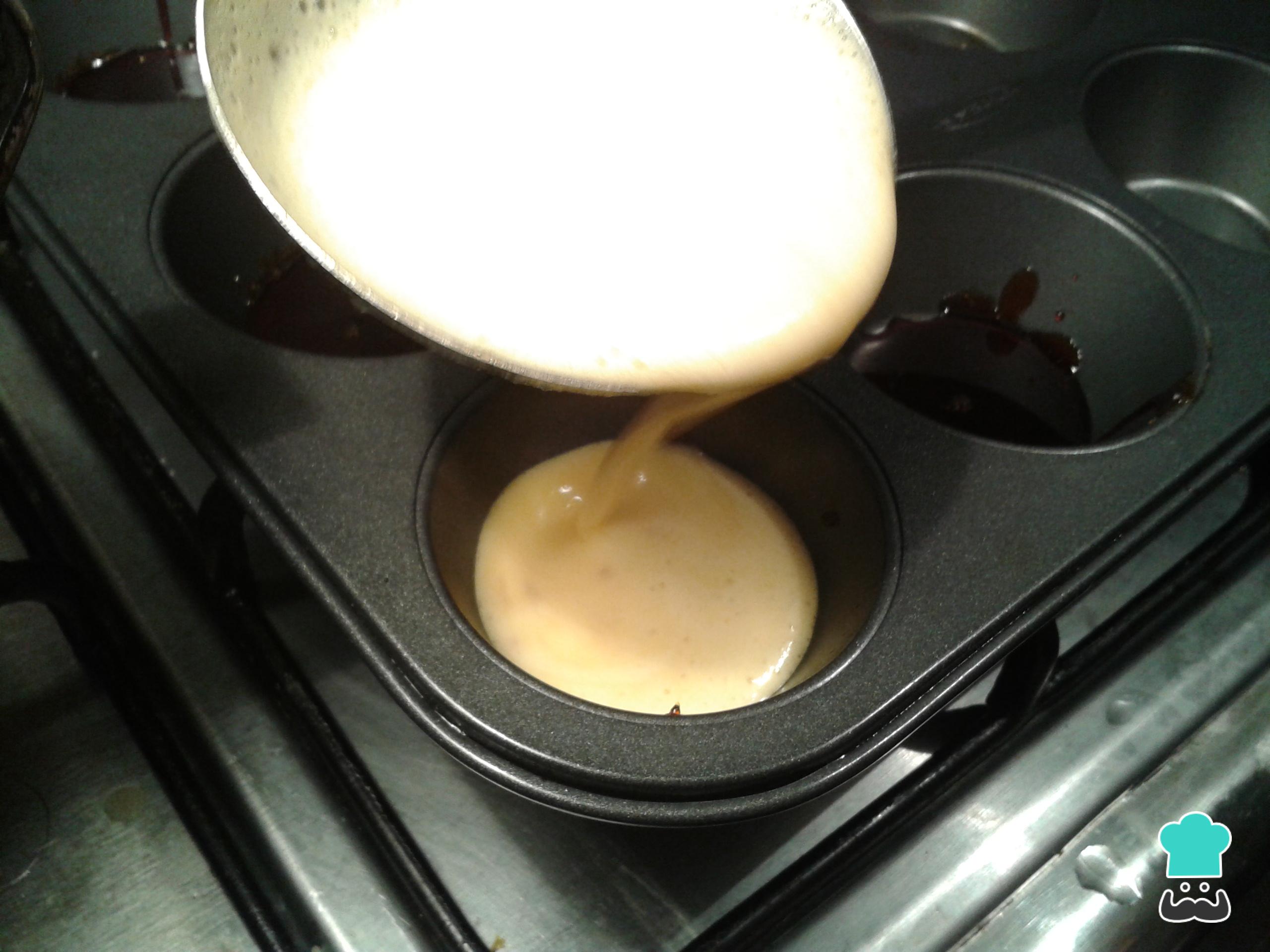 Entonces, colocamos una base de caramelo en cada molde individual y pasados unos minutos, vaciamos la mezcla del flan de turrón dentro.