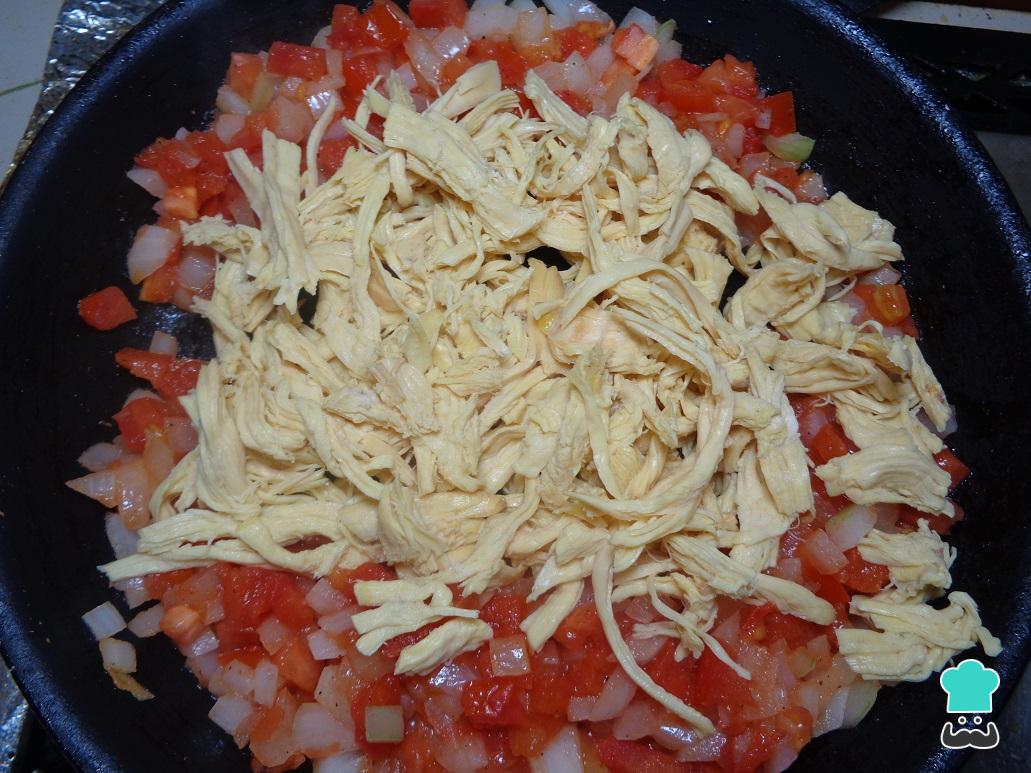 Una vez se observe transparente la cebolla, añadimos el pollo deshebrado, mezclamos y dejamos que todo se sazone junto por 6 minutos.