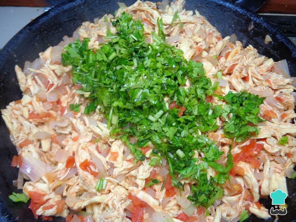Pasado este tiempo, añadimos el cilantro picado finamente e integramos a nuestro guiso de flautas de pollo al horno. Dejamos que todo se cocine junto por 6 minutos más y pasado este tiempo lo retiramos del fuego.