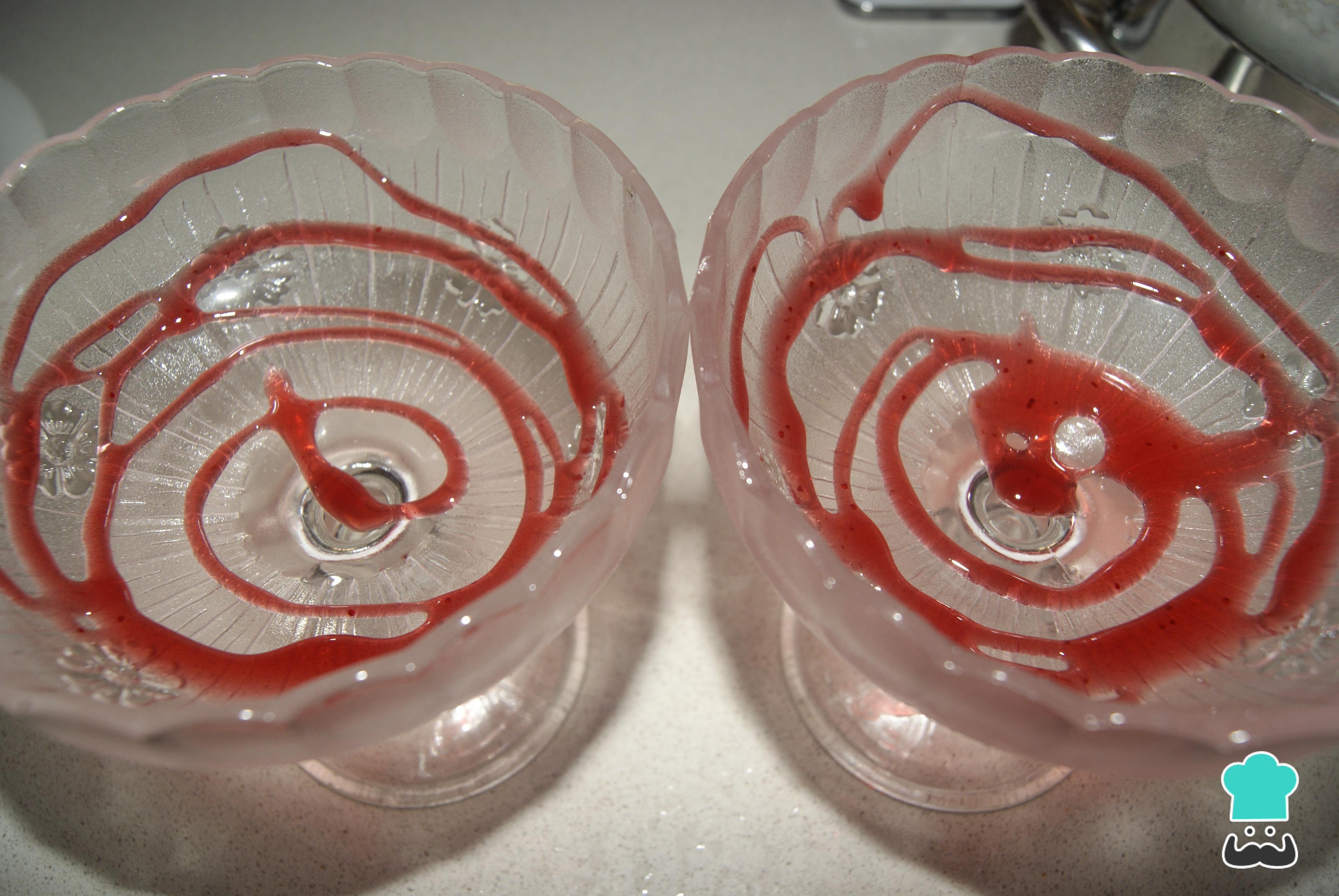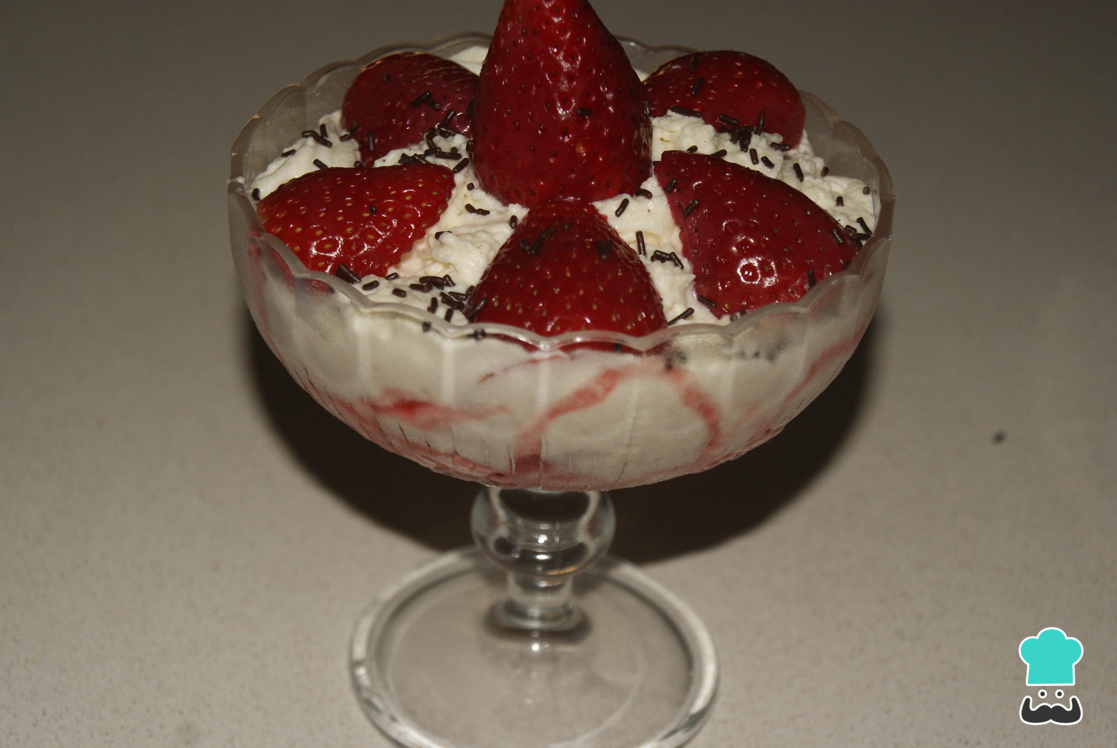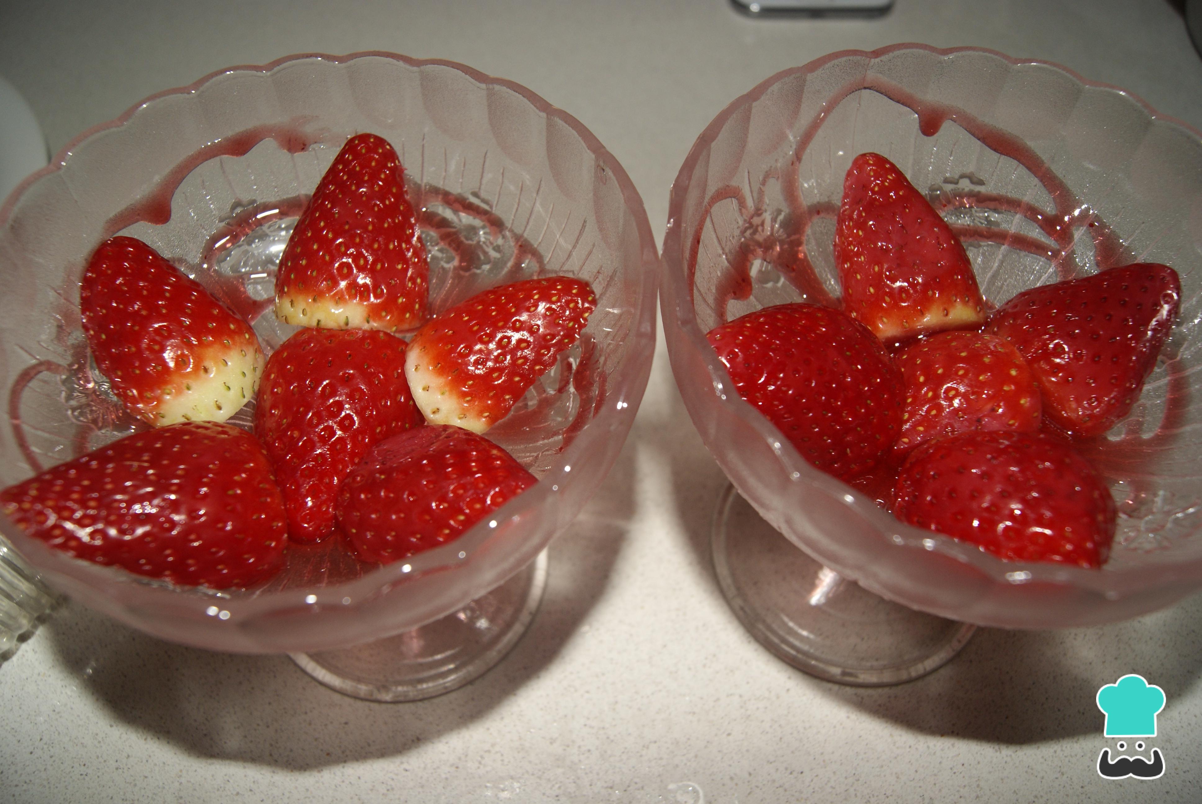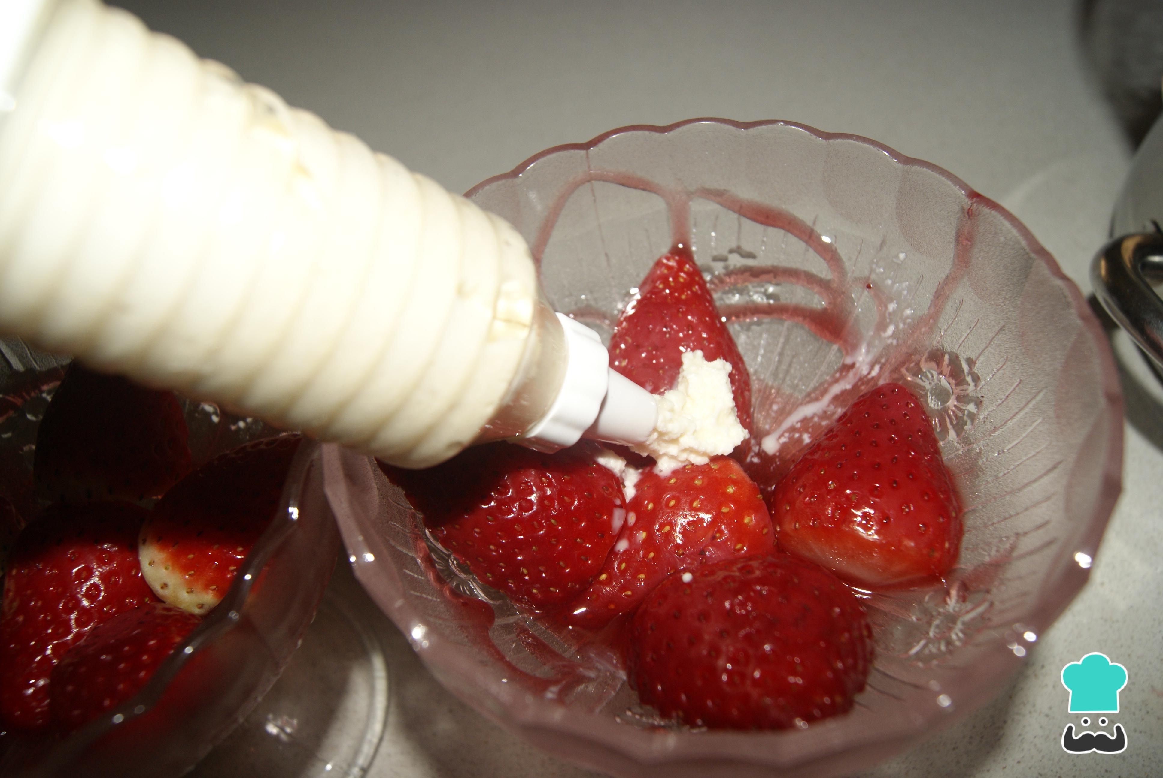 En una copa para postres, rociamos un poco de sirope de fresa. Este paso es opcional así que si no te gusta, puede preparar solo las fresas con nata montada.