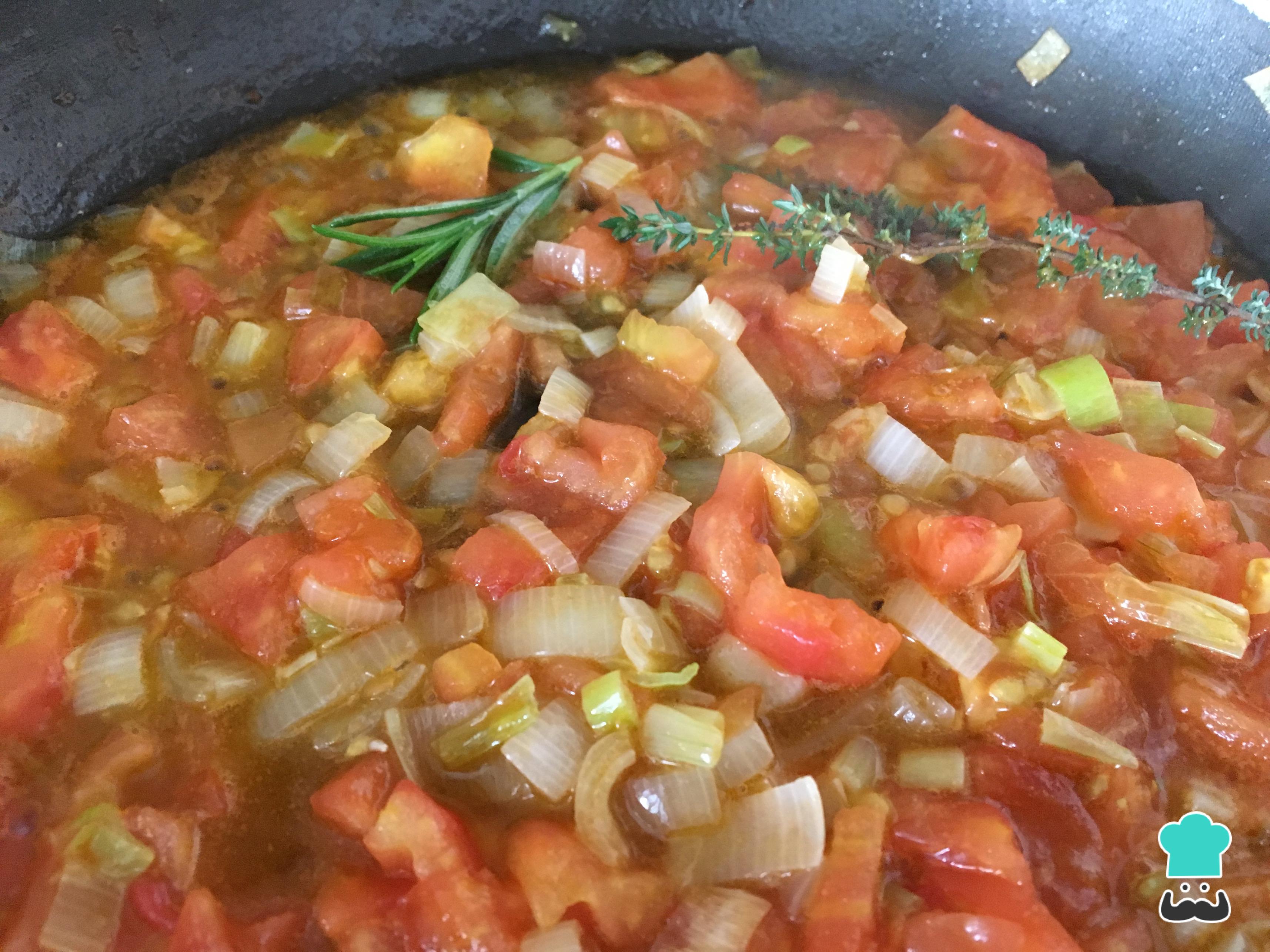 Hacemos un sofrito con la cebolleta picada y el tomate pelado y cortado en cuadraditos. Dejamos que se dore primero la cebolleta durante 3 minutos y luego añadimos el tomate, el romero y el tomillo y dejamos que se cocine durante 10 minutos más. Ponemos un poco de sal y pimienta negra molida.