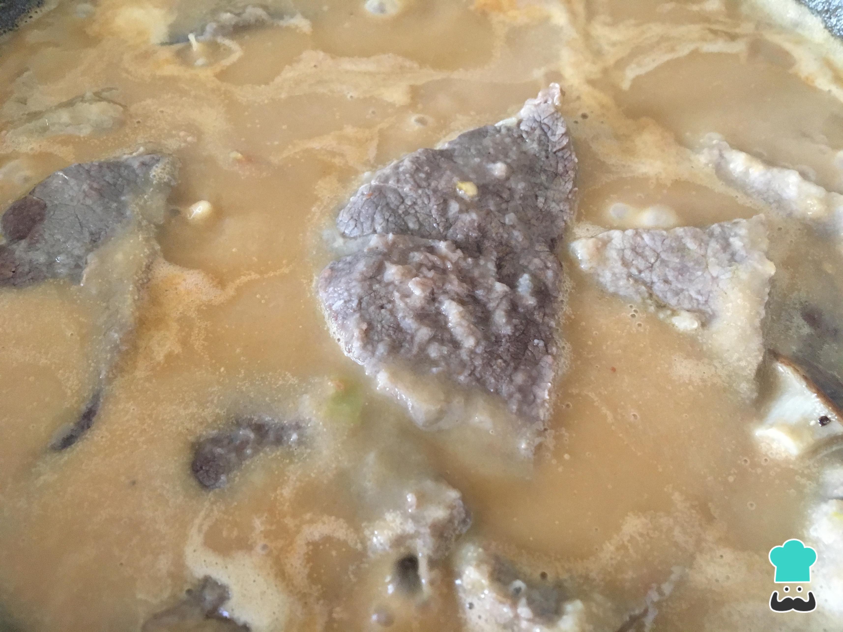 Pasamos el sofrito por la batidora y lo volvemos a poner en la sartén. Agregamos los filetes y el vino blanco. Dejamos que hierva el fricandó de ternera durante 20-25 minutos a fuego medio.