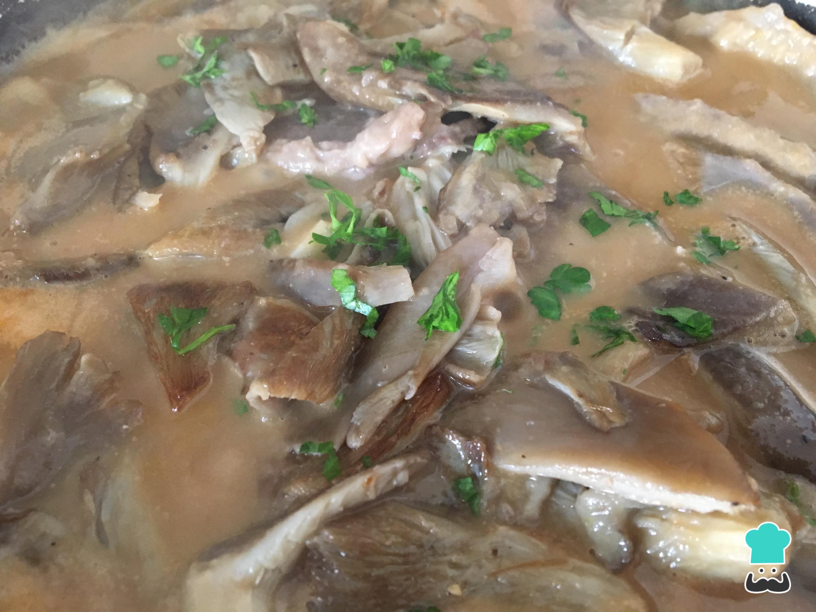 Añadimos las setas y un poco de perejil picado, y dejamos cocinar el fricandó con salsa de setas 8-10 minutos más.
