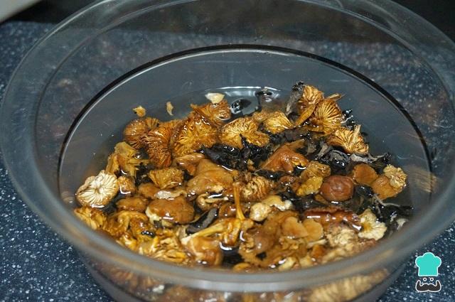 Lo primero que haremos para hacer el fricandó de cerdo es poner las setas secas en agua templada. Las dejaremos unos 15-20 minutos.