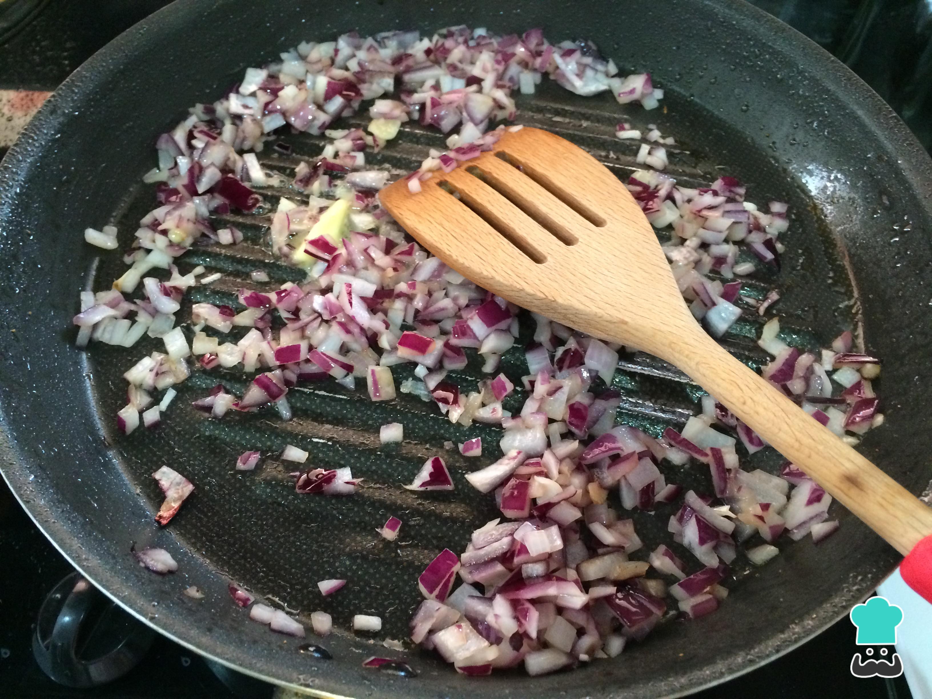 En la misma sartén, con un poco de aceite, saltear la cebolla y el ajo cortado finamente hasta que esté todo dorado.