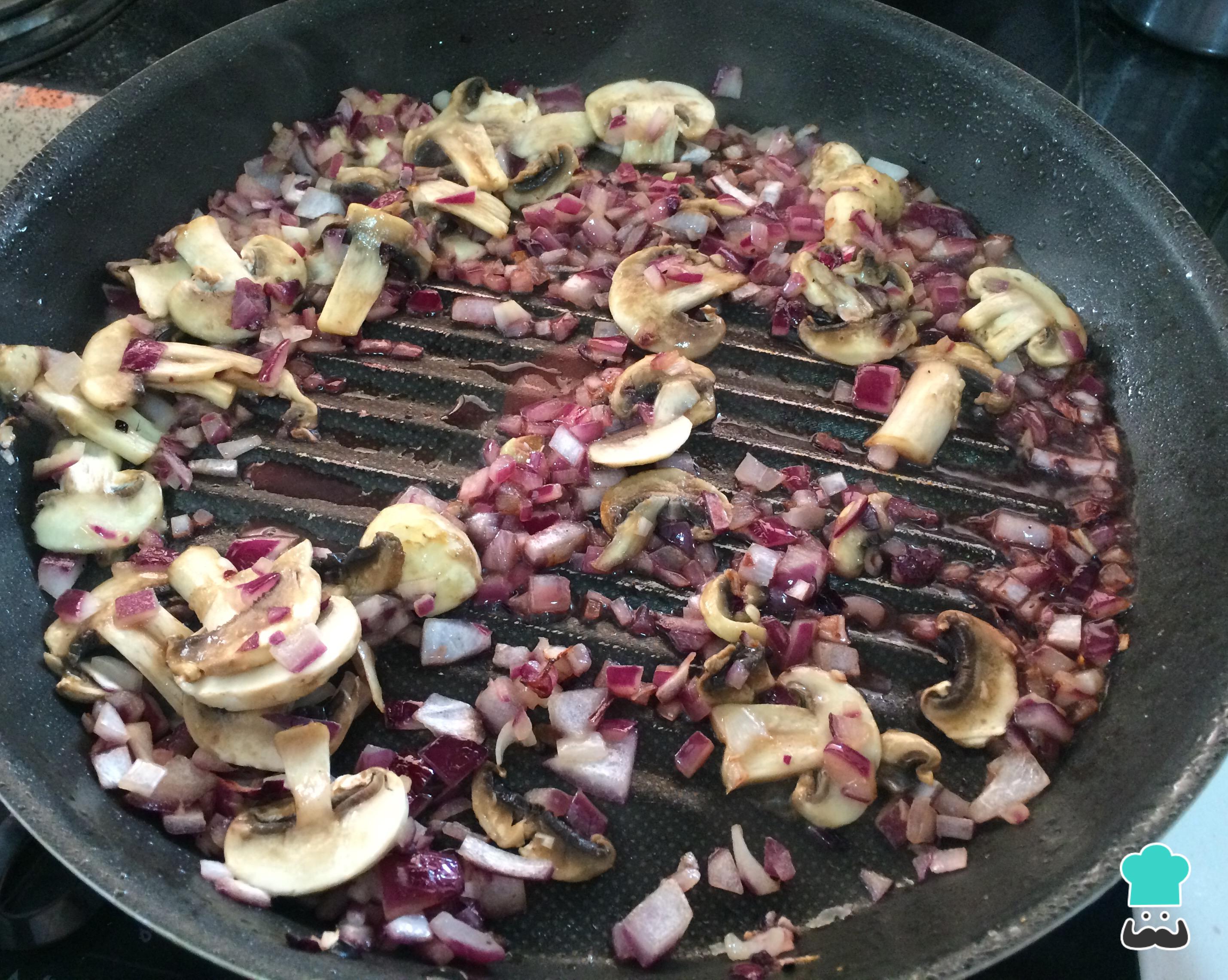 Añadir los champiñones cortados en rodajas y saltear durante unos minutos, agregar el vino y esperar a que el alcohol evapore.