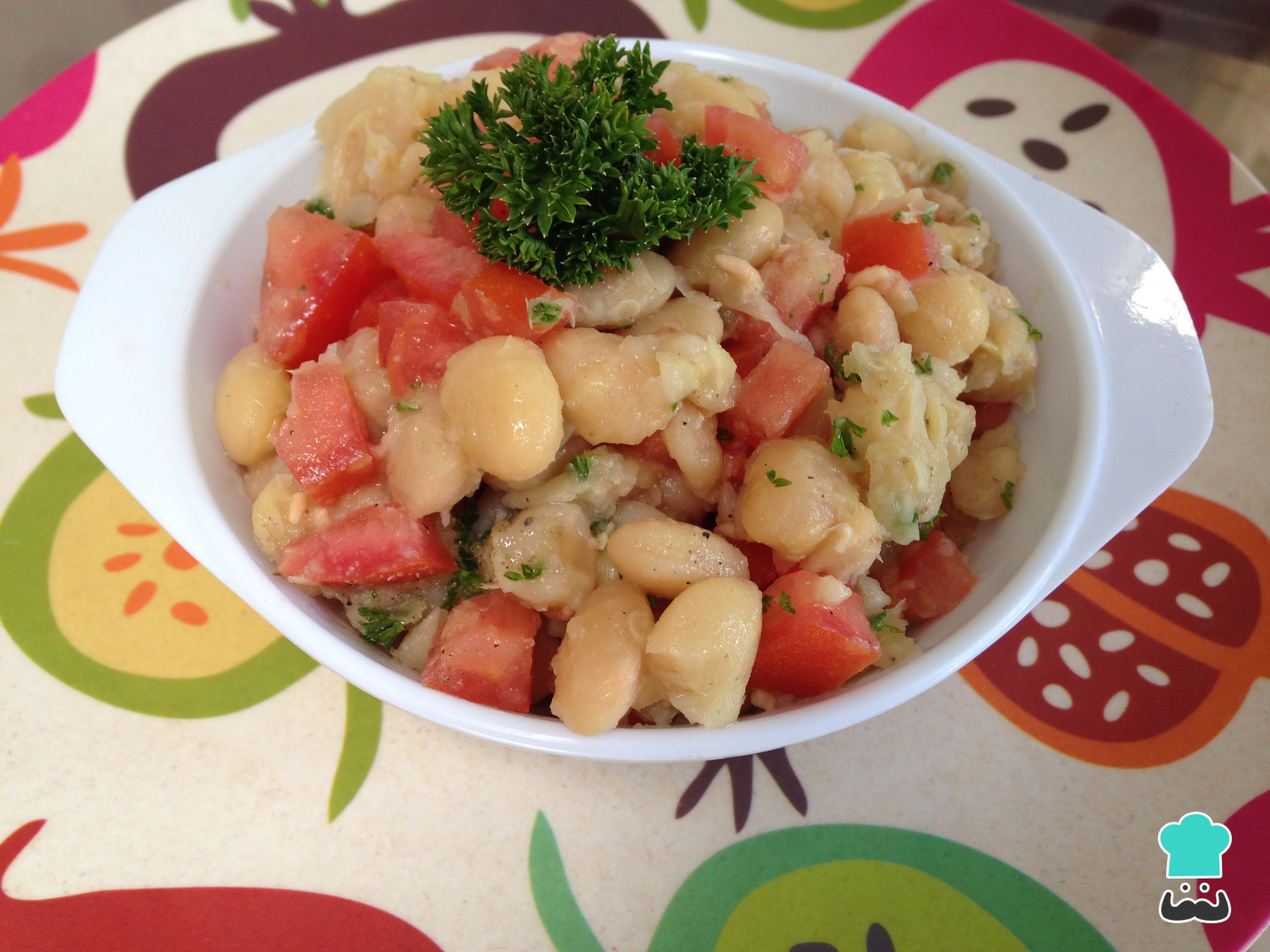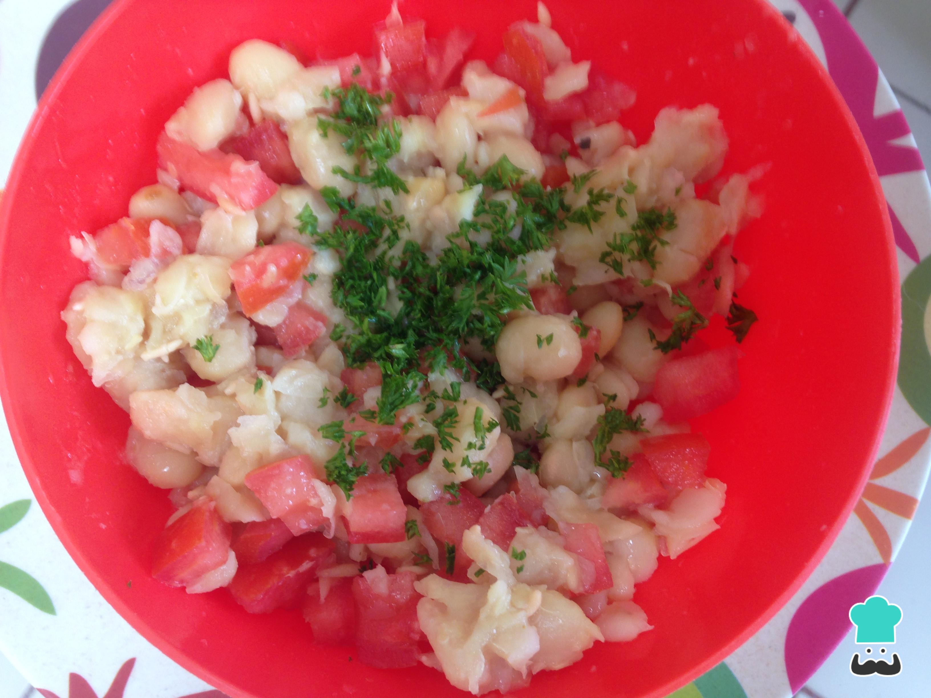 Pasada la hora retiramos los frijoles de la olla y escurrimos, mezclamos en un recipiente junto con el tomate y el perejil finamente picado, agregar aceite de oliva sal y pimienta.