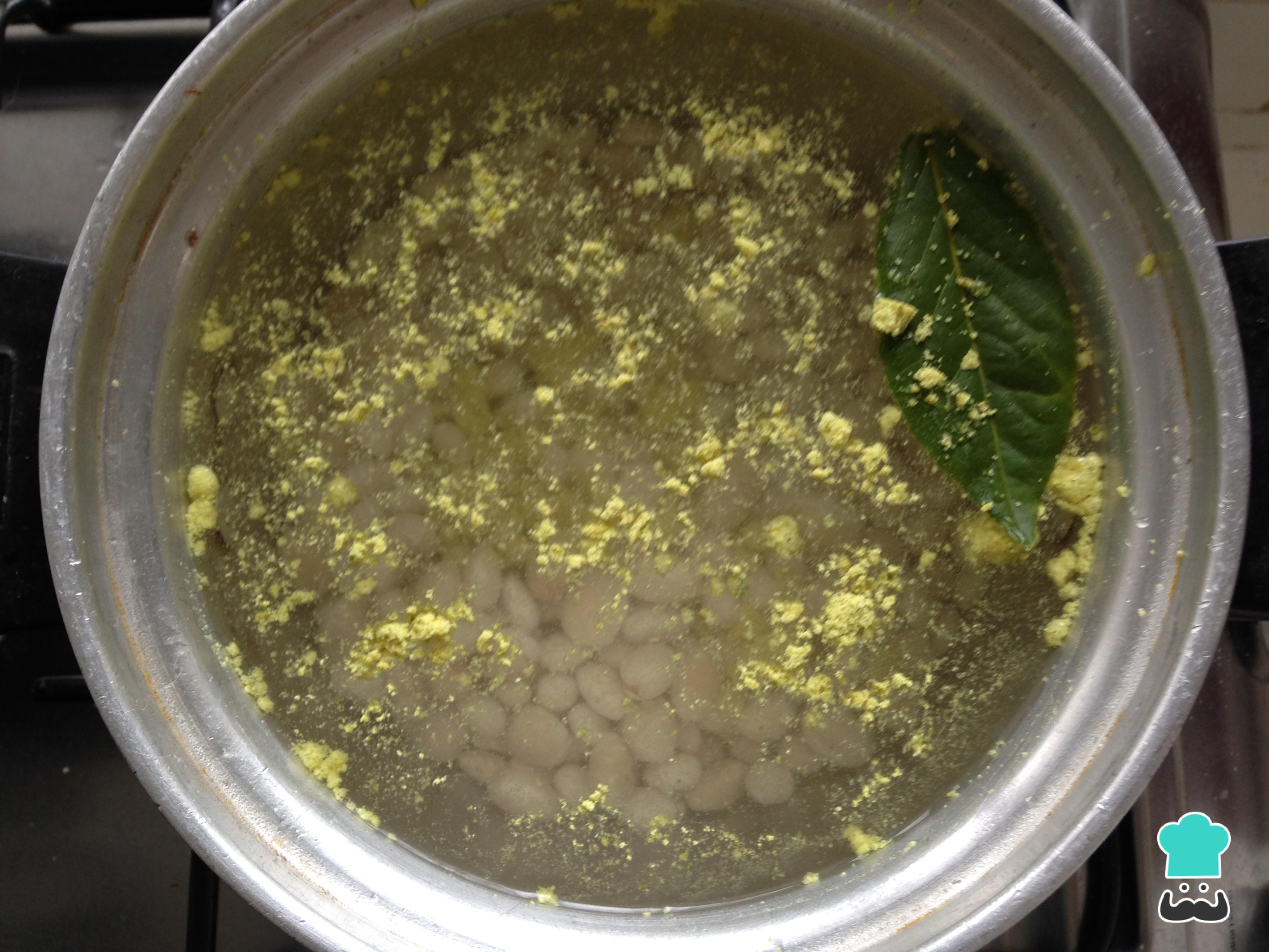 En la olla a presión cocinar los frijoles con abundante agua, con un cubo de caldo de gallina y hoja de laurel, durante una hora.