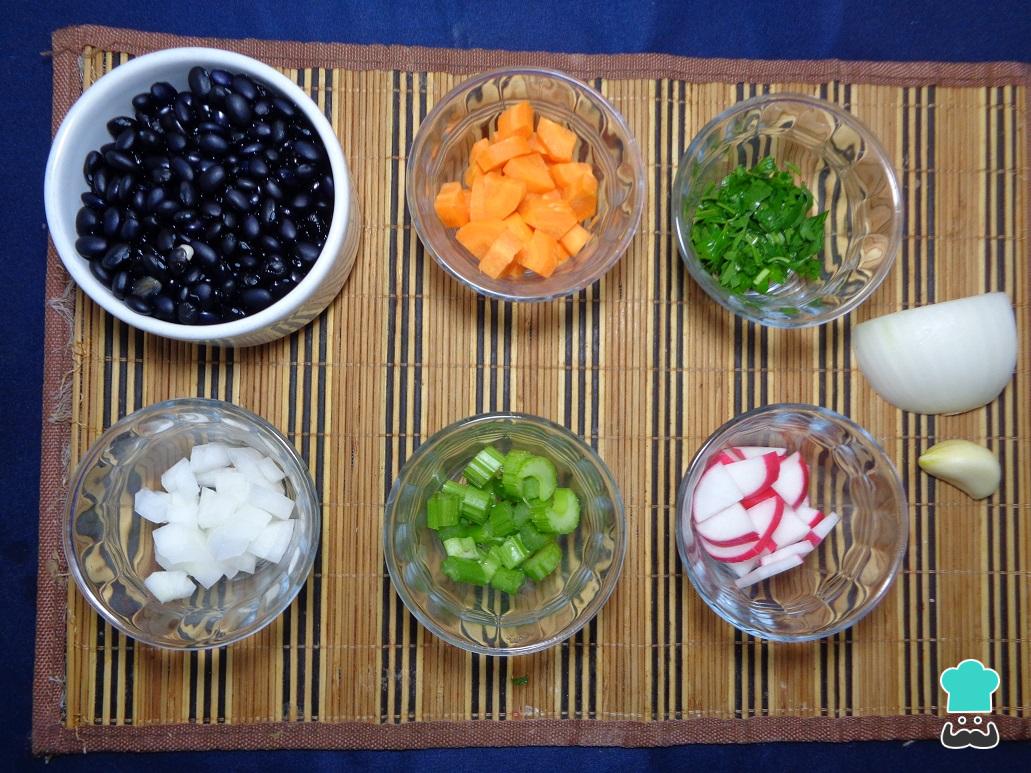 Comenzaremos la receta de frijoles charros vegetarianos reuniendo todos los ingredientes que vamos a necesitar.