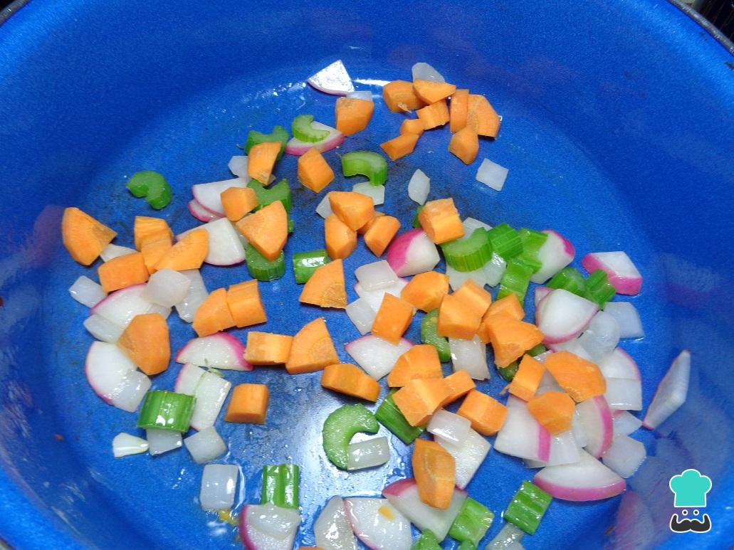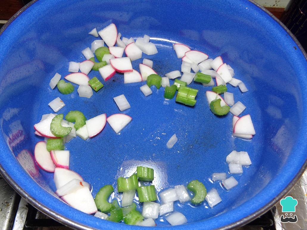 Mientras tanto, en un sartén agregamos un poco de aceite, colocamos la otra media cebolla, el poro, los rábanos y el apio bien picados y los pochamos hasta que tengan una apariencia dorada y blanda, y de igual manera agregamos un poco de sal y pimienta.