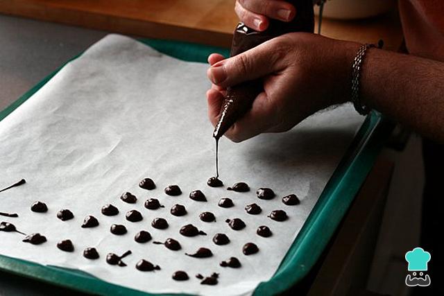 Cogemos una bandeja de horno, la forramos con papel de hornear y, poco a poco y con mucha paciencia, vamos colocamos pequeñas chispas de chocolate con la manga pastelera.